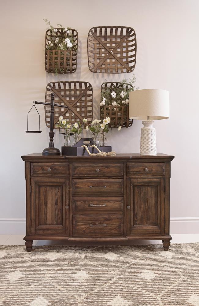 Give your dining room an elegant atmosphere with this handsome, rustic server. This brown dining server keeps essentials in one place as it exudes simple style. Six spacious drawers and two cabinets make organization a breeze. The top drawers are lined in soft, brown felt to protect delicate items. Exclusive to Coaster, this piece is beautifully designed with metal hardware and natural wood grains for cool, classic style.