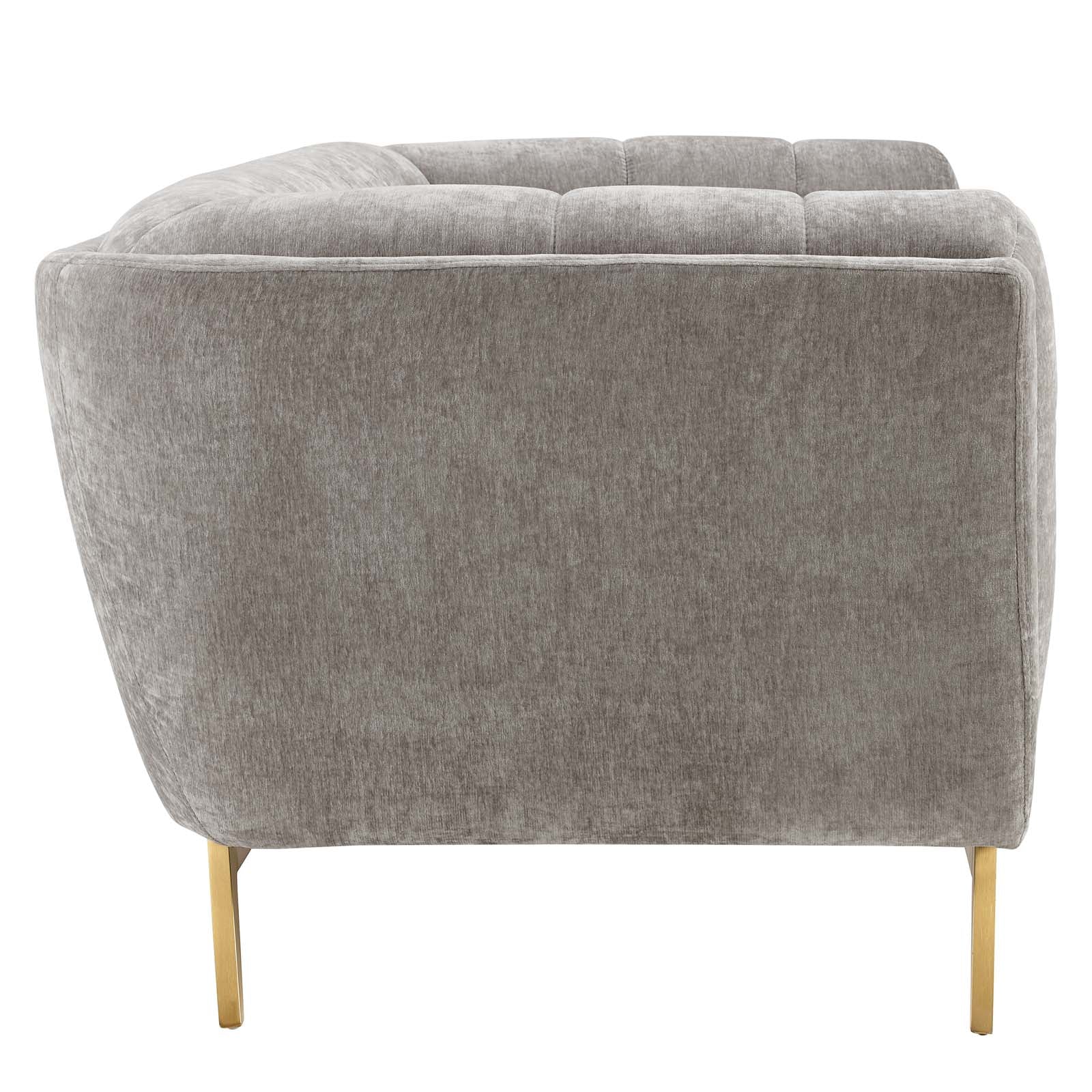 Generously update your décor with Bestow Crushed Performance Velvet Sofa. Uniquely designed with a striking broad profile, Bestow comes in soft, stain-resistant performance velvet polyester upholstery with a crushed texture, dense foam padding, and elegant button tufting. Sturdily positioned on brushed gold splayed stainless steel legs with non-marking foot caps, Bestow boasts a bountiful living room seating design brimming with possibilities. With ample seat depth and overscaled frame, invite all your guests to sit comfortably in this 12" high back and armrest collection perfect for mid-century, vintage modern, or contemporary décors. Weight Capacity: 900 lbs.