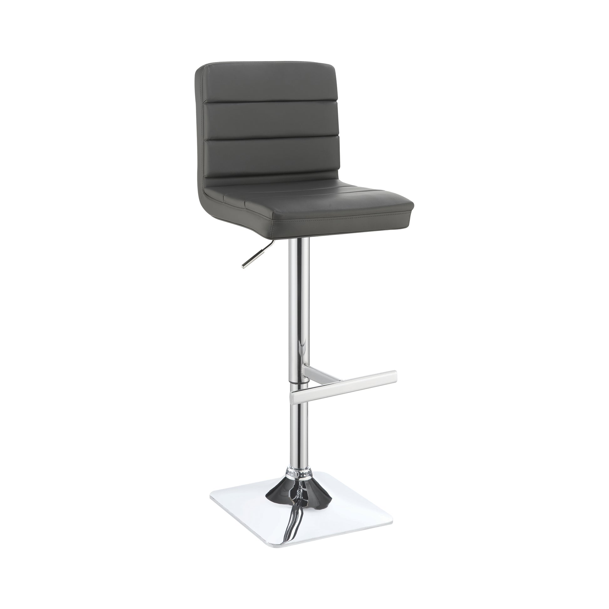 Chic grey leatherette cements the contemporary credentials of this adjustable barstool. Ideal for a home lounge or remodeled kitchen island, the stool features plush cushioning and a full back for ample support and comfort. A pedestal base boasts a square foot and built-in footrest. A chrome finish gleams and delivers a sleek, refined look. With a height adjustable seat, this stool complements modern bar tables and counters.