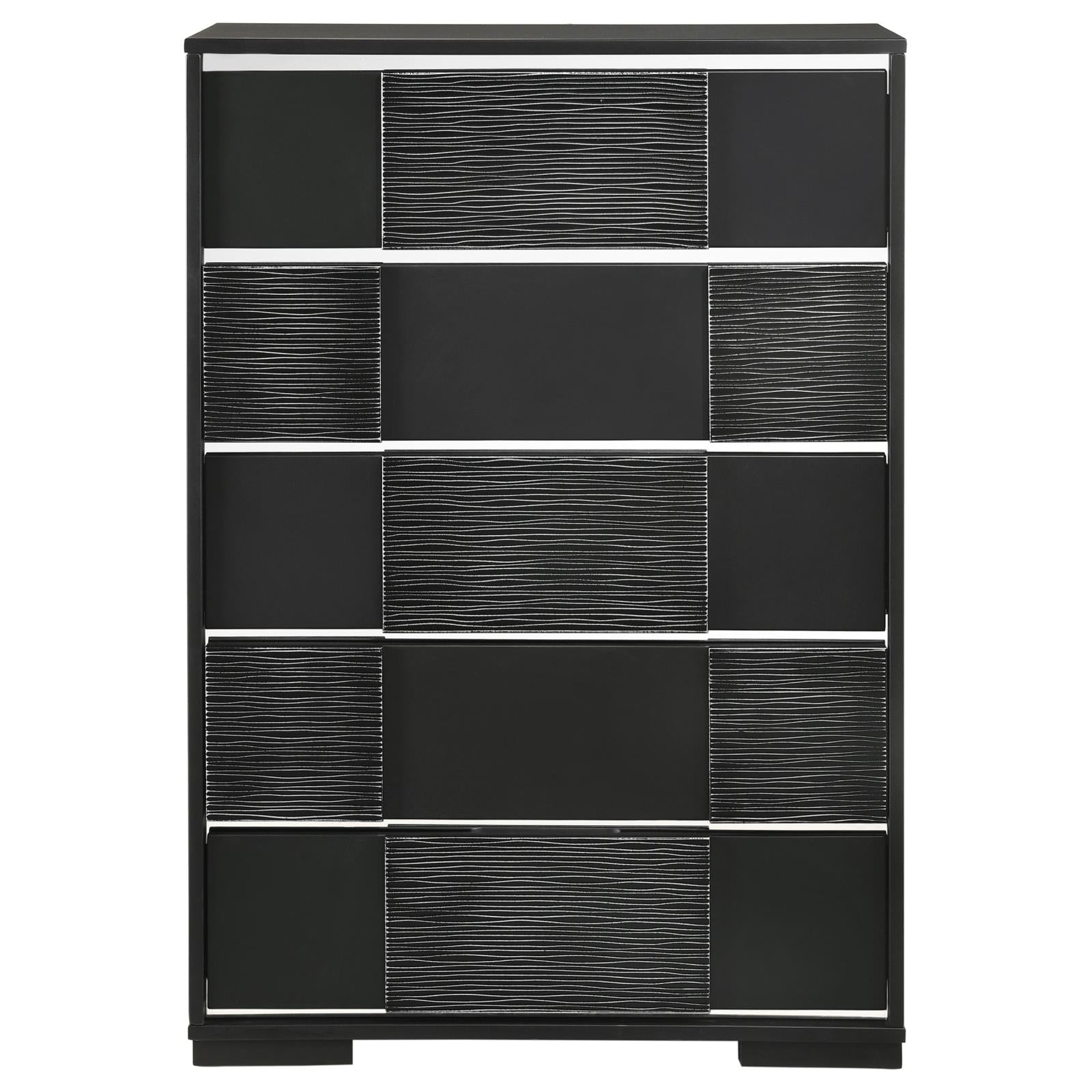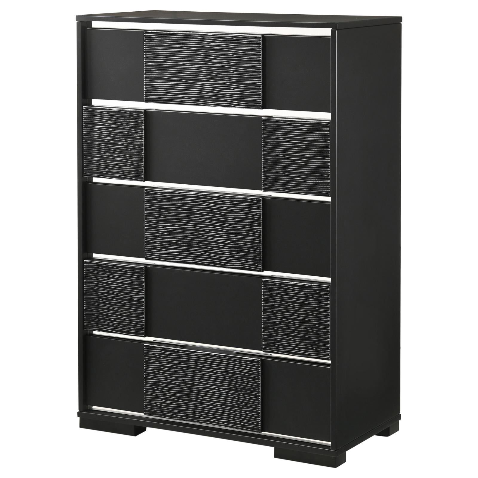 Bold paneling blends with shining lines of chrome to create the striking aesthetic of this five-drawer chest. With plenty of space for an extensive wardrobe, it keeps any bedroom organized in style. Each drawer is enhanced by a chambered drawer front for a look that exudes modern grace. Chambered trim rounds out the contemporary design of this gorgeous piece. Crafted of tropical hardwood and Asian veneer, this chest is as durable as it is beautiful.