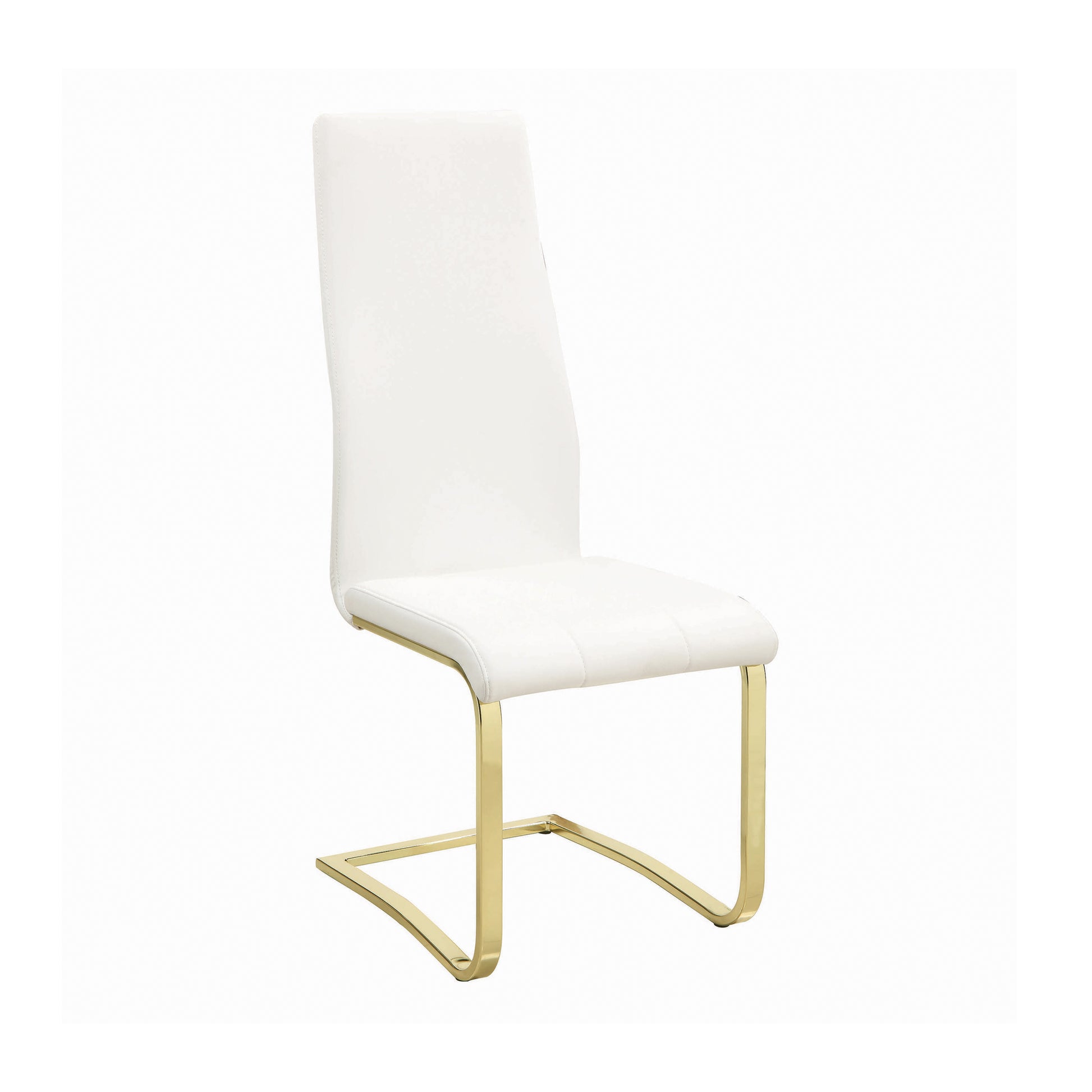 Smooth and clean, this armless dining chair adds a crisp feel to any dining room. Perfect for a bright or bold space, the L-shape legs feature a radiant gold finish. An elongated seat back tapers slightly, giving this chair its elegant personality. Soft white cushioning is dressed up with smooth seams down the seat. Create the illusion of open space with the statement-making brilliance of crisp color and metallic shine.