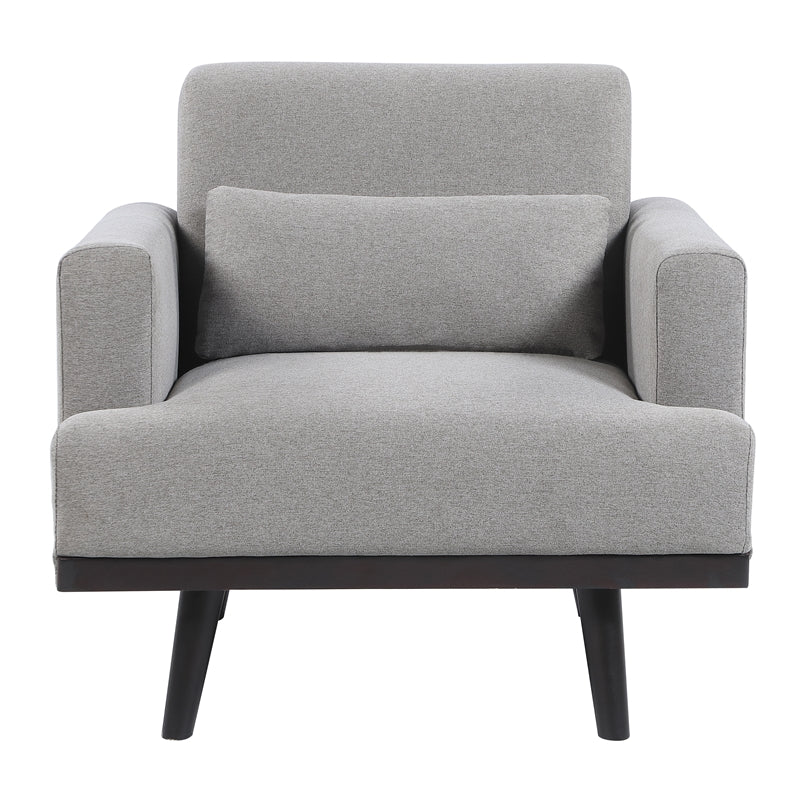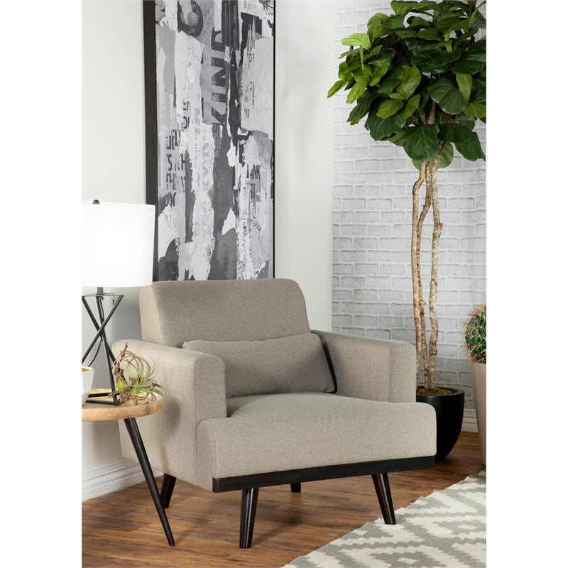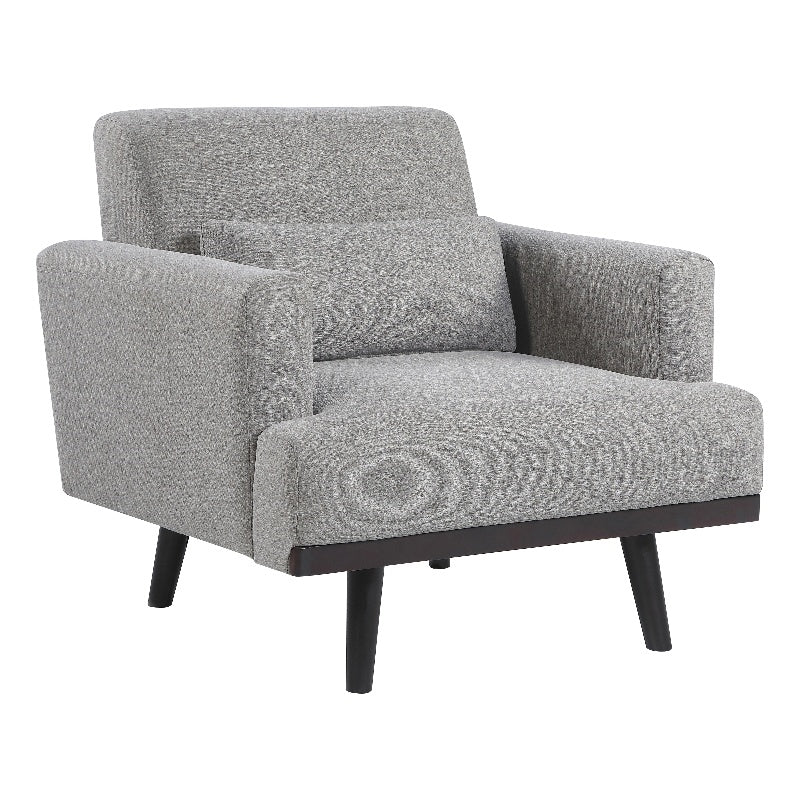 Modern rooms keep it simple and stylish with a hint of mid-century modern design at play. This accent chair offers a versatile sharkskin finish fabric upholstery that blends with a variety of design palettes. Embrace the iconic rolled arms and fixed T-cushion silhouetting of a chair with dark brown tapered legs. A fixed, tall back enhances seating comfort, as an elongated lumbar pillow delivers extra back support. Make this chair a go-to respite for relaxation in a modern living room, family room, or den.