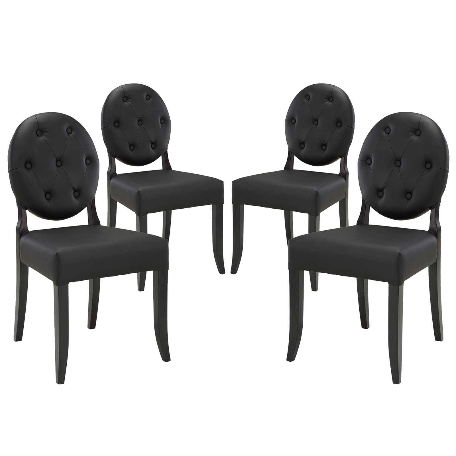 Playing off the whimsical spatial elements of the Button Chair, this buttoned vinyl installment gives transparency a home. Bring light-filled moments inward with an inner sense of laughter and delight. With its padded black vinyl seating and black legs, settle fancy as you uncover yet greater horizons.