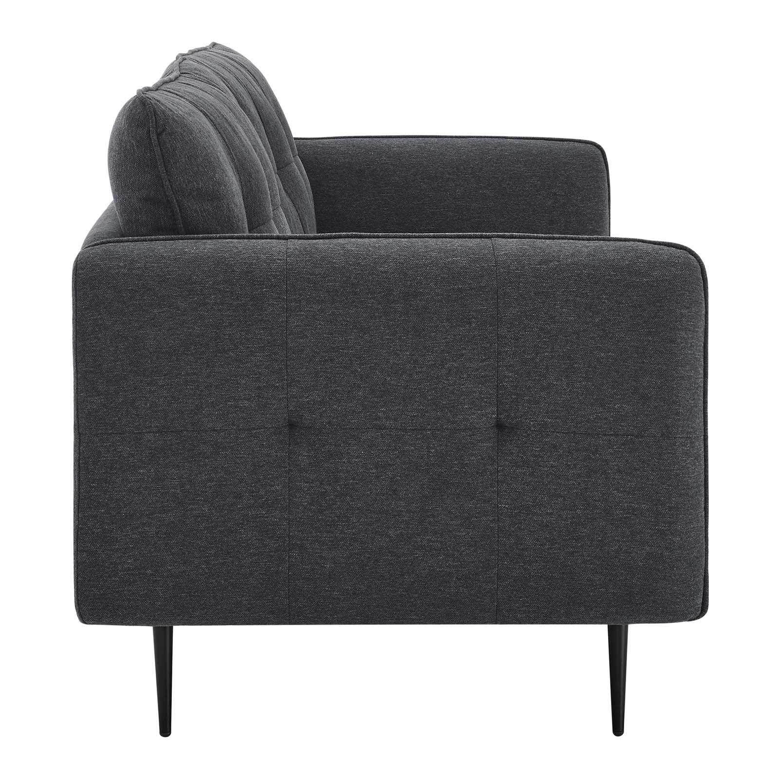 Heighten your living space with the Cameron Tufted Fabric Sofa. Displaying square tufting and French piping detail, this upholstered sofa is rich in contemporary charm and mid-century modern inspiration. Covered in soft polyester fabric, this tufted sofa features dense foam padding and a sinuous spring support system to create a premium seating experience for you and your guests. Sturdily constructed from solid wood, this fabric sofa sits atop black metal legs with non-marking foot pins. Modernizing the traditional furniture shopping experience, this sofa-in-a-box ships directly to your doorstep in a conveniently portable box with easy-to-follow instructions. This retro modern sofa is an ideal addition to your living room, lounge room, or home office. Assembly required. Sofa Weight Capacity: 900 lbs.