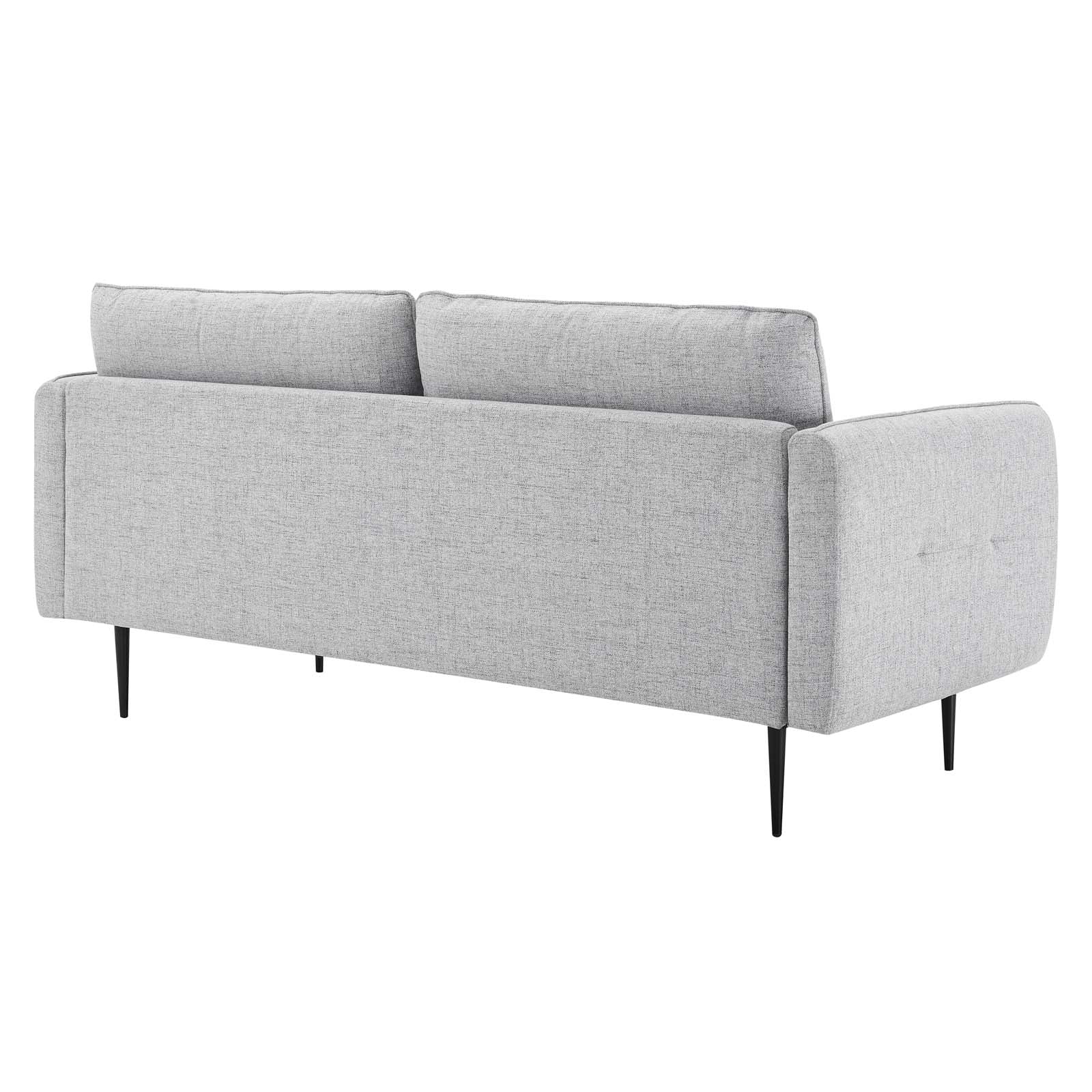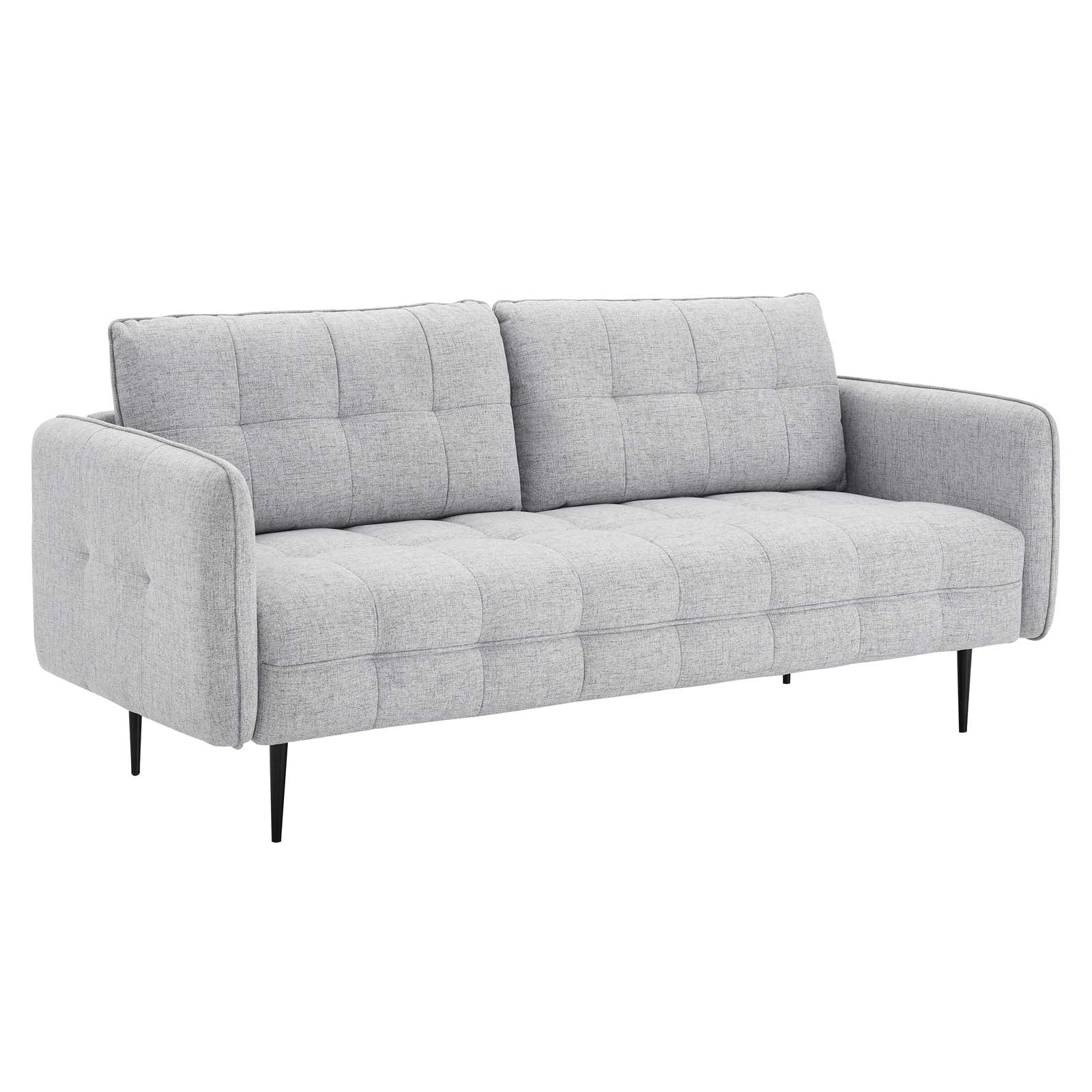 Heighten your living space with the Cameron Tufted Fabric Sofa. Displaying square tufting and French piping detail, this upholstered sofa is rich in contemporary charm and mid-century modern inspiration. Covered in soft polyester fabric, this tufted sofa features dense foam padding and a sinuous spring support system to create a premium seating experience for you and your guests. Sturdily constructed from solid wood, this fabric sofa sits atop black metal legs with non-marking foot pins. Modernizing the traditional furniture shopping experience, this sofa-in-a-box ships directly to your doorstep in a conveniently portable box with easy-to-follow instructions. This retro modern sofa is an ideal addition to your living room, lounge room, or home office. Assembly required. Sofa Weight Capacity: 900 lbs.