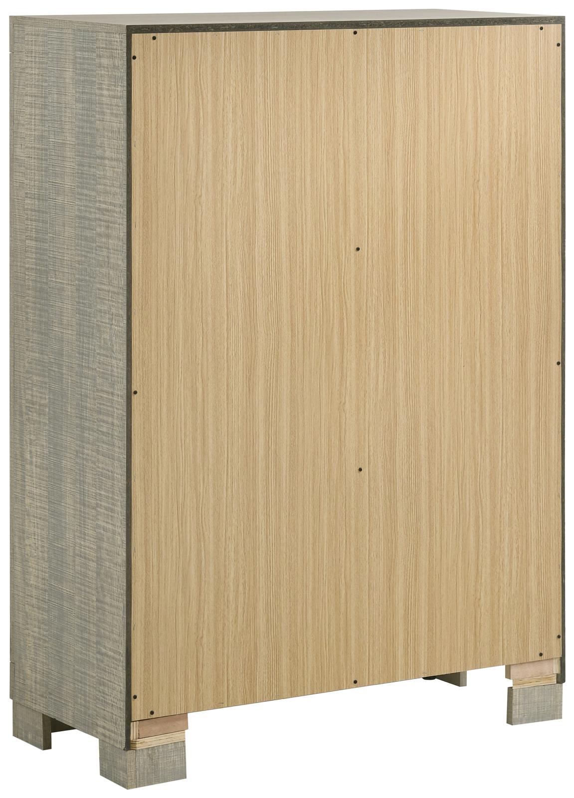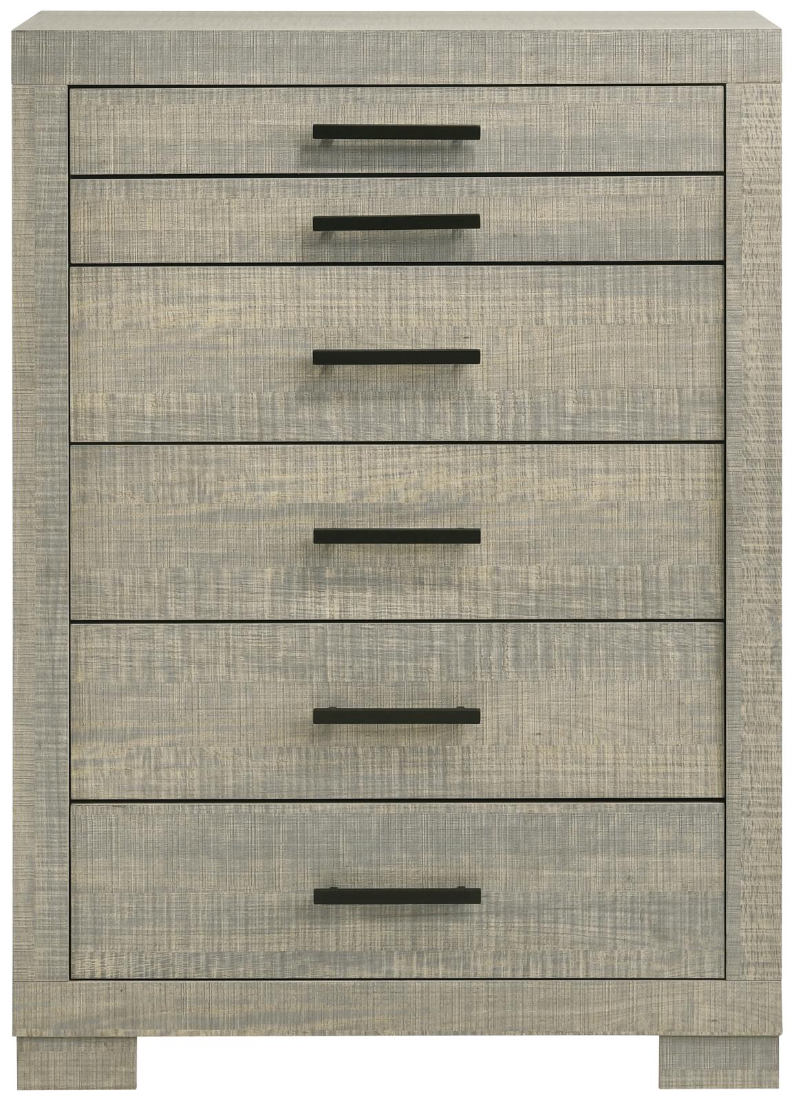 A neutral finish and clean lines direct the modern silhouetting of this five-piece bedroom set. This crisp, stylish set adds a fresh contemporary look with just enough romantic softness. Rough sawn gray oak finish Asian hardwoods and wood products join smooth melamine to create a stellar feel. Admire a paneled bed with a tall headboard showcasing vertical slats, anchoring this fashionable set with case pieces delivering graduated drawer fronts with easy-glide operation and gunmetal finish hardware. Set includes one bed; one nightstand; one chest; one dresser, and one mirror.