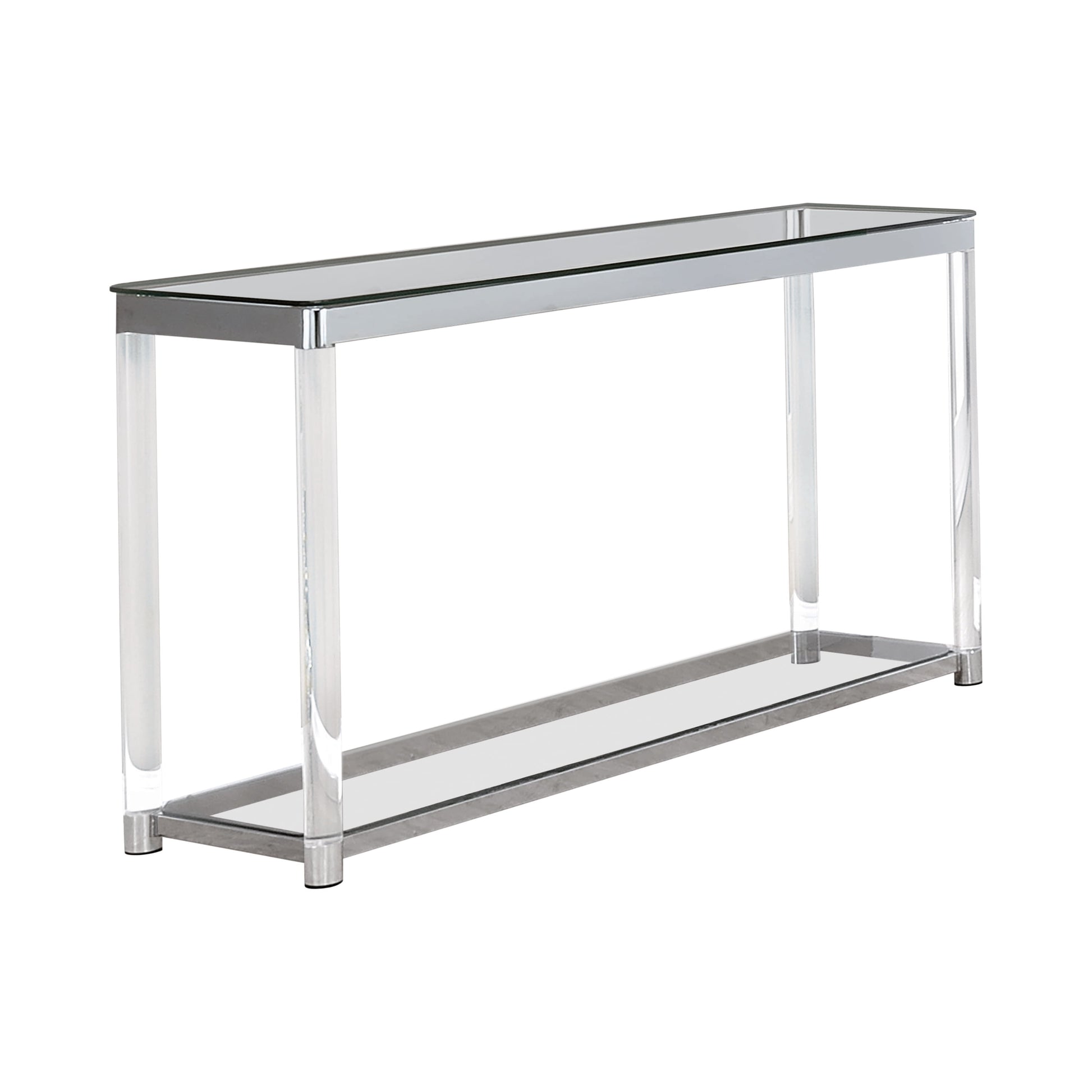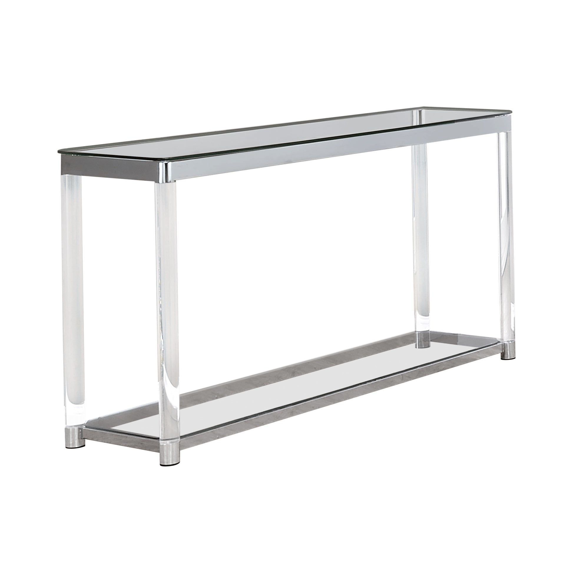 Create an elongated look with the bold metallic details from this clear sofa table. Complete with rounded acrylic legs, the sleek silhouette is full of glamour. Display sculptures or photos on the glass top or sleek built-in shelf. Celebrate a minimalist-inspired silhouette with the clear lines in the chic frame. Perfect for any modern or classic motif, this table is versatile and elegant.