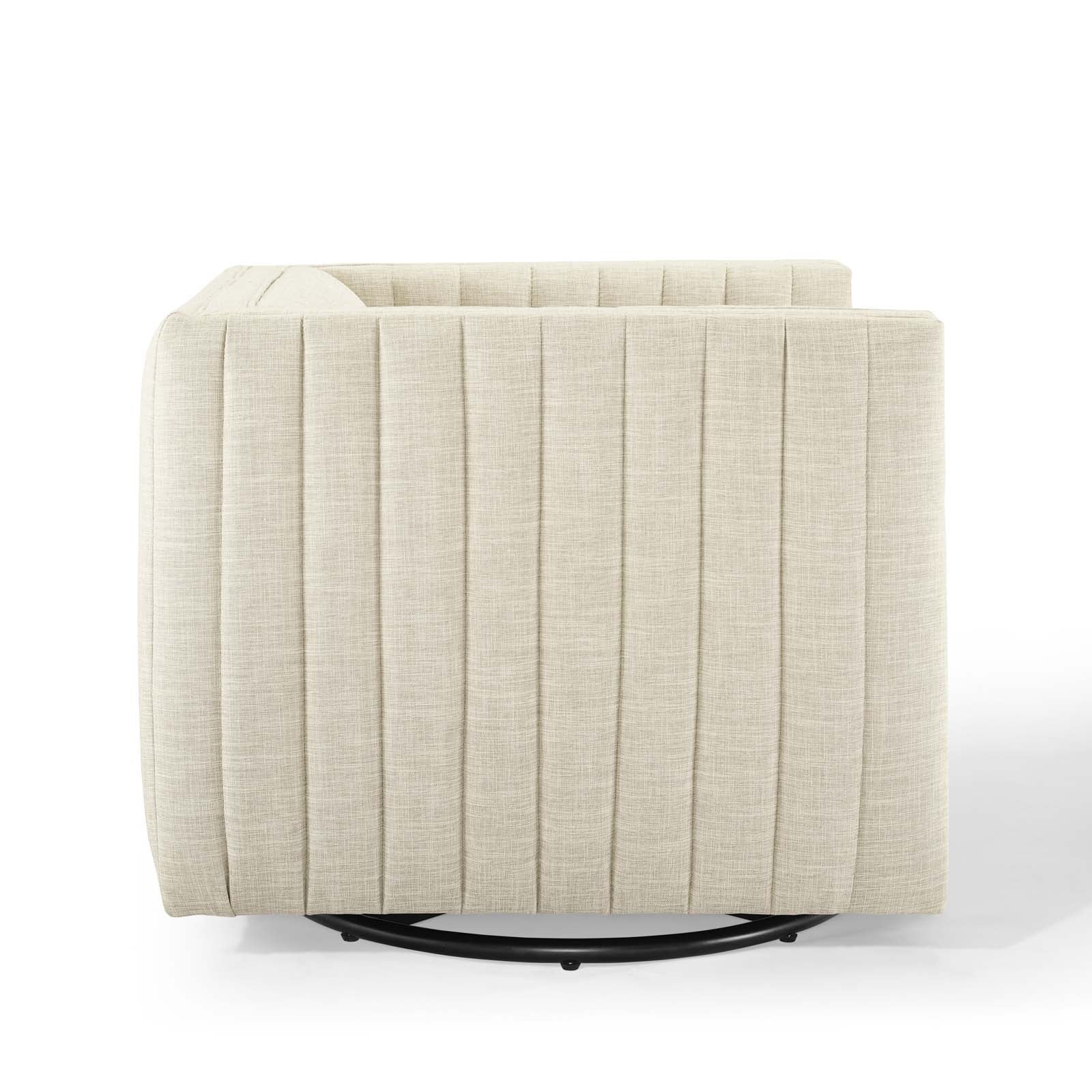 Follow the organic linear design of the Conjure Channel Tufted Fabric Upholstered Swivel Armchair. Relax into the glam deco style and allow the streamlined effect of the vertical channel tufting details to direct your living room decor. The Conjure Accent Chair adds a charming retro modern style to your living room, lounge room, or home office. Individually wrapped spring coils are covered with dense foam padding and a soft polyester fabric upholstery for a premium seating experience. This elegant swivel chair rests securely on a rotating base that complements any modern home or apartment. Armchair Weight Capacity: 441 lbs. Comes Fully Assembled.