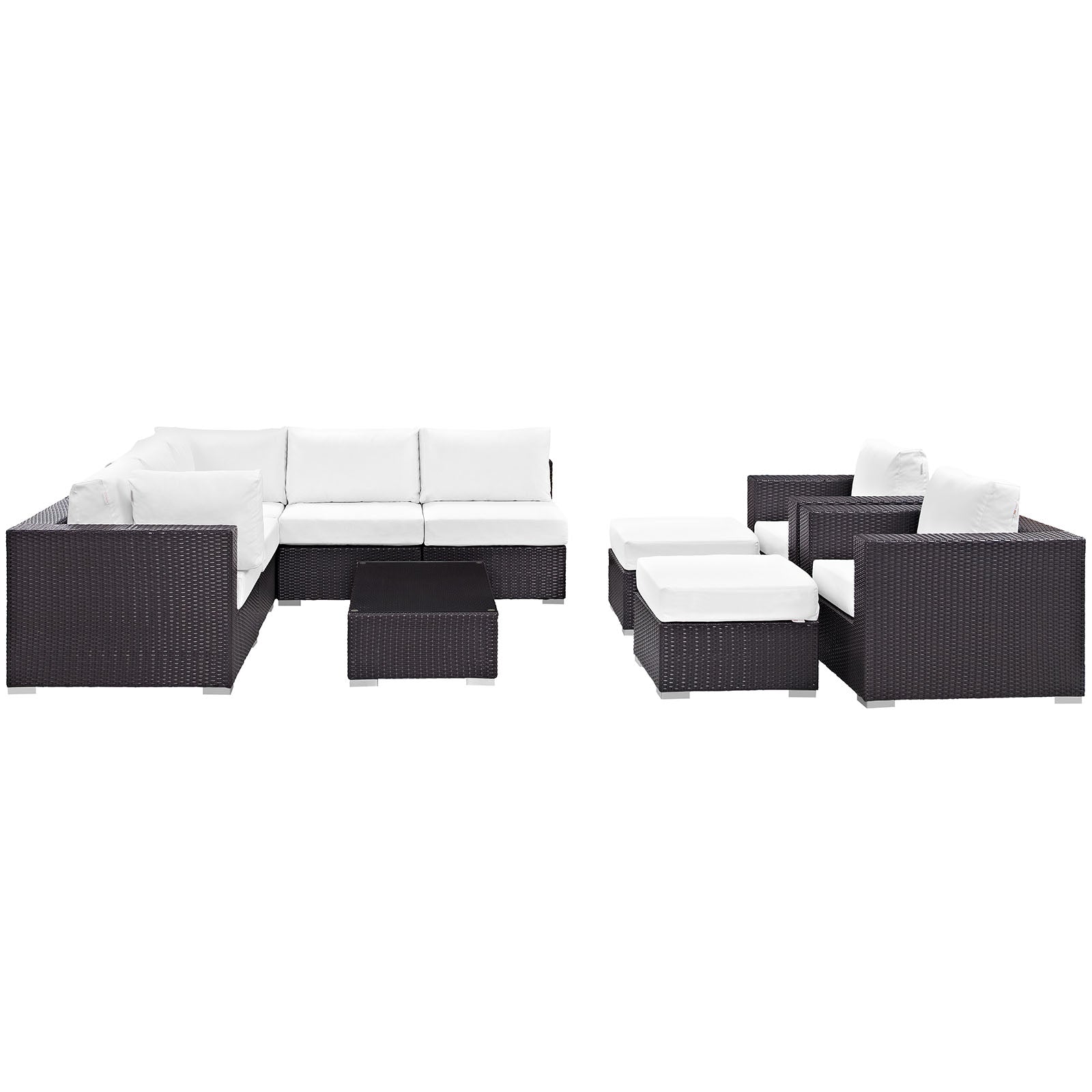 Gather stages of sensitivity with the Convene Outdoor Sectional series. Made with a synthetic rattan weave and a powder-coated aluminum frame, Convene is a versatile outdoor furniture set that shifts and combines according to the spontaneous needs of the moment. Outfitted with all-weather fabric cushions, leave a positive impression on friends and family while enhancing your patio, backyard, or poolside repast in this series of palpable distinction. This installment of the series is an Outdoor Patio Sectional Sofa Set.