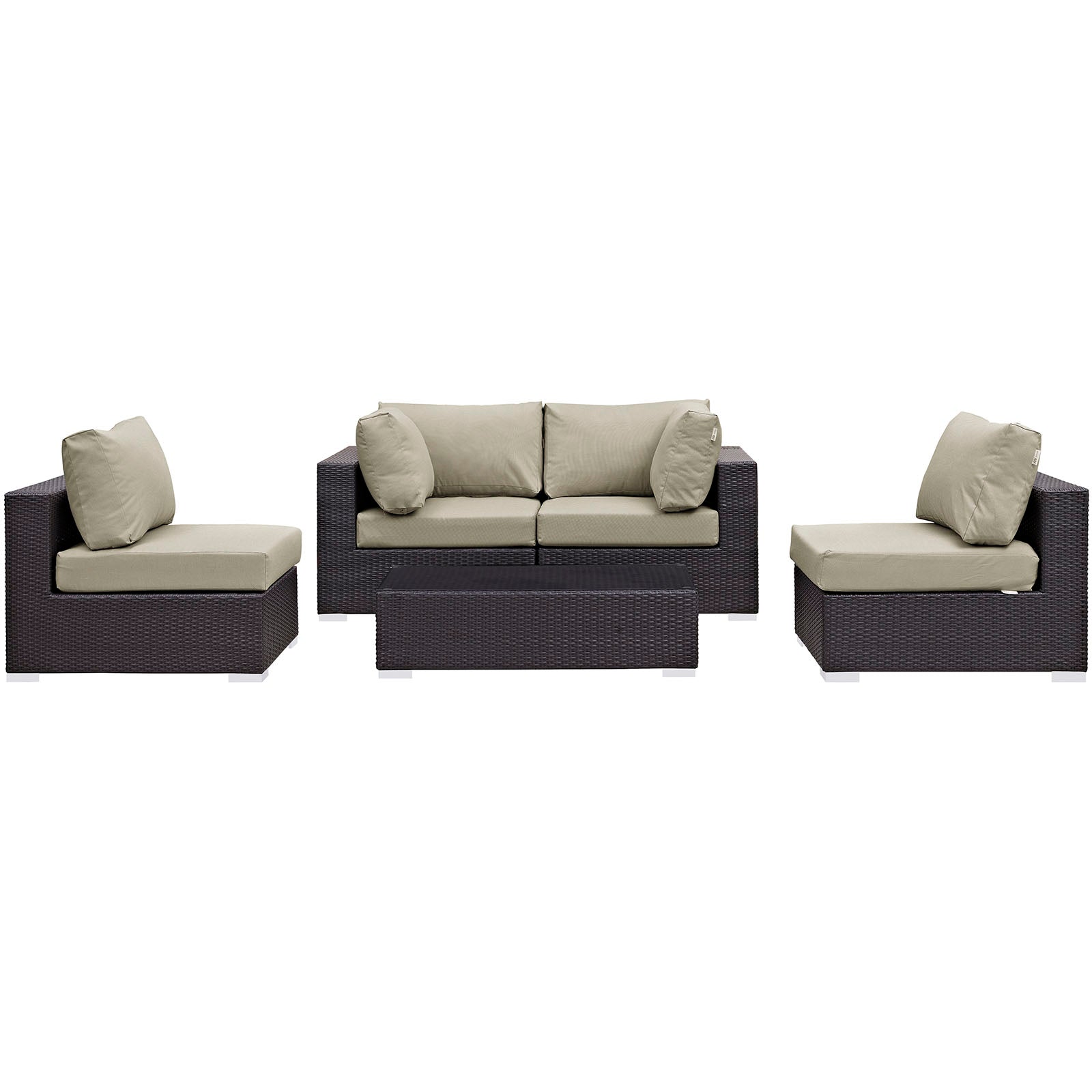 Gather stages of sensitivity with the Convene Outdoor Sectional series. Made with a synthetic rattan weave and a powder-coated aluminum frame, Convene is a versatile outdoor furniture set that shifts and combines according to the spontaneous needs of the moment. Outfitted with all-weather fabric cushions, leave a positive impression on friends and family while enhancing your patio, backyard, or poolside repast in this series of palpable distinction. This installment of the series is an Outdoor Patio Sectional Sofa Set.