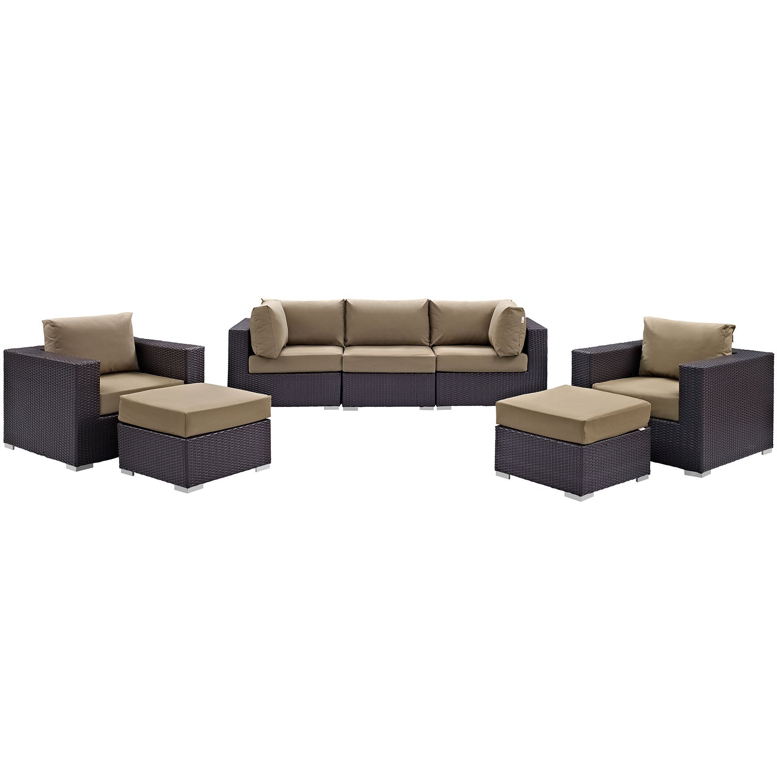 Gather stages of sensitivity with the Convene Outdoor Sectional series. Made with a synthetic rattan weave and a powder-coated aluminum frame, Convene is a versatile outdoor furniture set that shifts and combines according to the spontaneous needs of the moment. Outfitted with all-weather fabric cushions, leave a positive impression on friends and family while enhancing your patio, backyard, or poolside repast in this series of palpable distinction. This installment of the series is an Outdoor Patio Sectional Sofa Set.