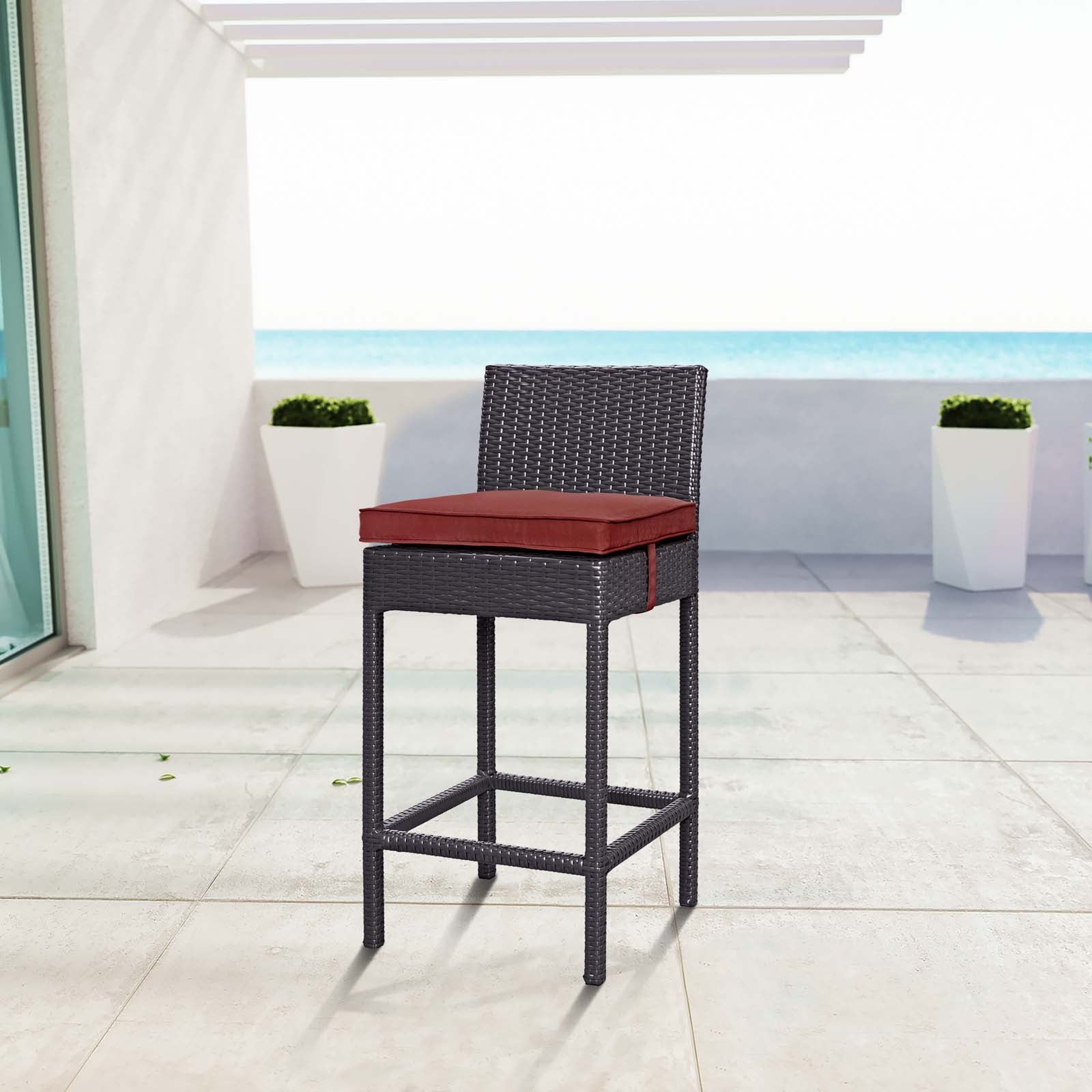 Gather stages of sensitivity with the Convene Outdoor Bar series. Made with a synthetic rattan weave and a powder-coated aluminum frame, Convene Outdoor Bar Stool belongs to a versatile outdoor collection that shifts and combines according to the spontaneous needs of the moment. Outfitted with all-weather fabric cushions, leave a positive impression on friends and family while enhancing your patio, backyard or poolside repast in this series of palpable distinction. This installment of the series is an Outdoor Patio Bar Stool.