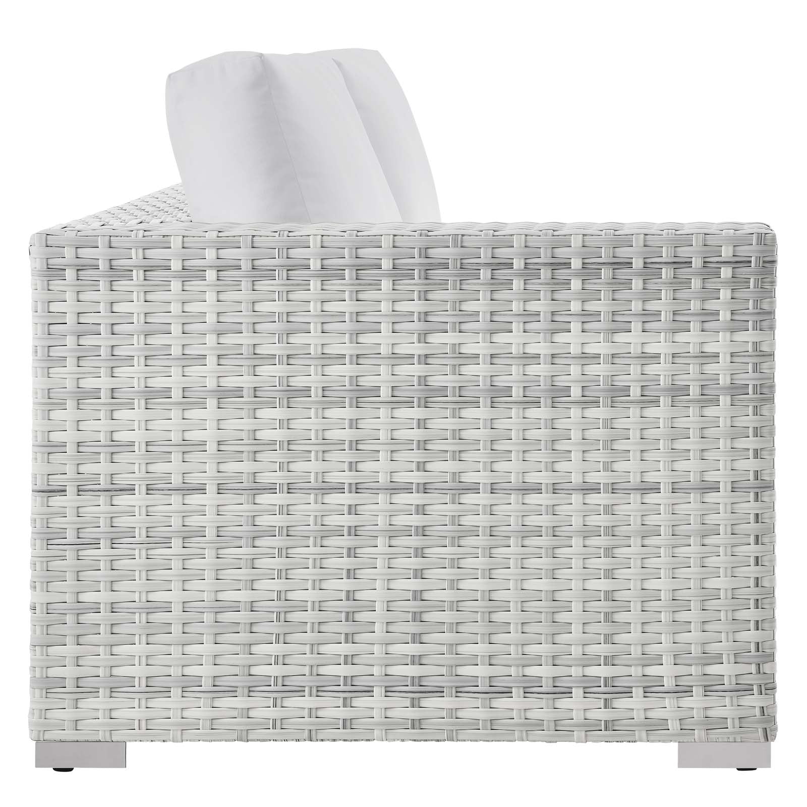Gather stages of sensitivity with the Convene outdoor sectional series. Made with a synthetic rattan weave and a powder-coated aluminum frame, Convene is a versatile left-arm loveseat from an outdoor collection that shifts and combines according to the spontaneous needs of the moment. Outfitted with all-weather fabric cushions, the Convene Left-Arm Loveseat leaves a positive impression on friends and family while enhancing your patio, backyard, or poolside retreat with palpable distinction.
