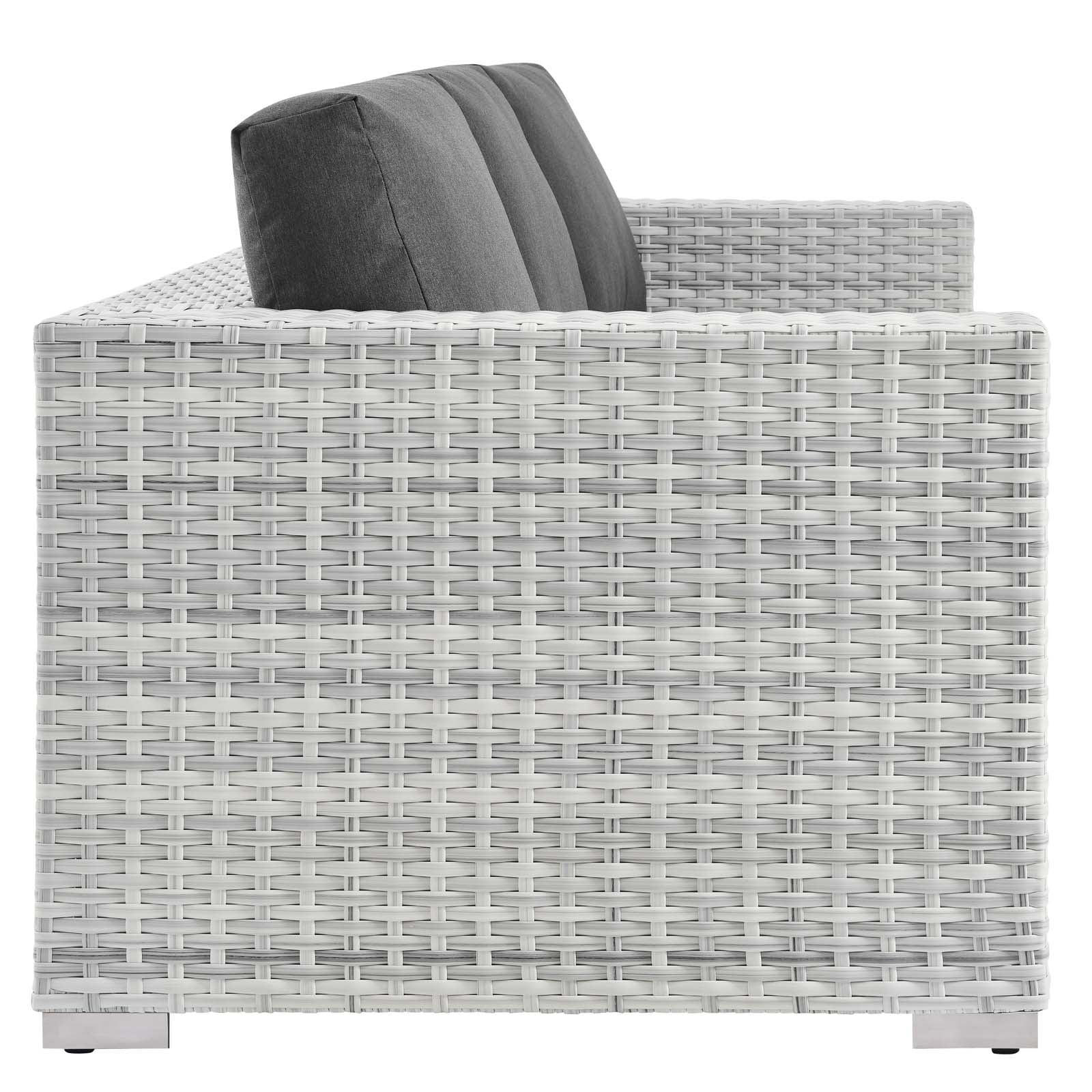 Gather stages of sensitivity with the Convene outdoor sectional series. Made with a synthetic rattan weave and a powder-coated aluminum frame, Convene is a versatile patio sofa from an outdoor collection that shifts and combines according to the spontaneous needs of the moment. Outfitted with all-weather fabric cushions, the Convene Outdoor Sofa leaves a positive impression on friends and family while enhancing your patio, backyard, or poolside retreat with palpable distinction.
