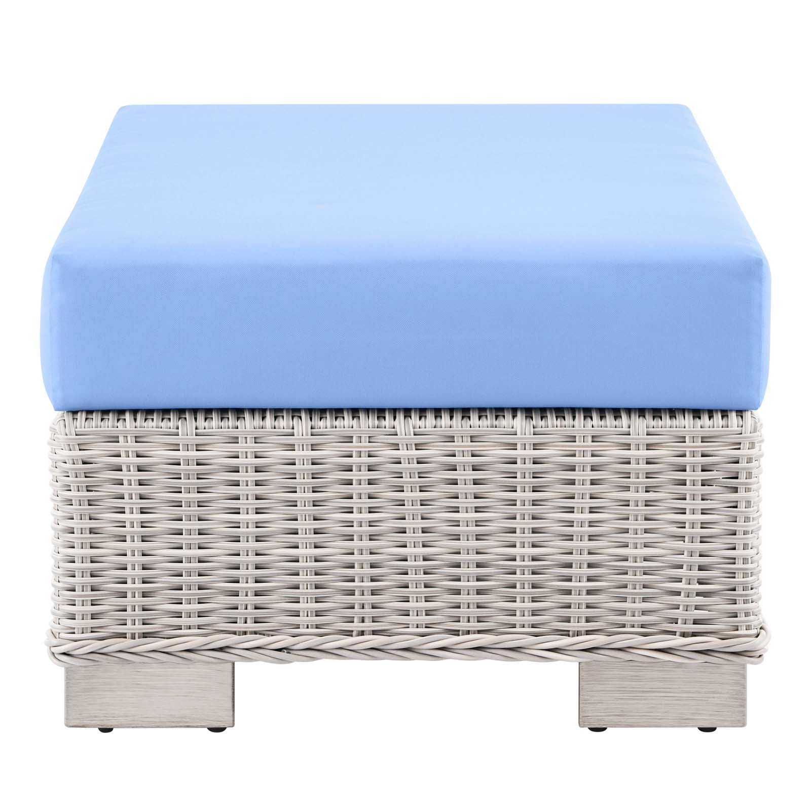 Enjoy fresh air and alfresco relaxation with the Conway Outdoor Patio Wicker Rattan Ottoman. Wrapped in UV-resistant light gray synthetic wicker rattan, this patio ottoman boasts organic texture and a neutral hue that brings a calming presence to your outdoor space. The frame of this outdoor ottoman is crafted with durable powder-coated aluminum and rests on L-shaped legs with plastic foot glides. A thick foam padded cushion covered with a removable, water-resistant polyester cover offers a comfortable seat and affixes securely to the ottoman with a cord tension attachment. Trending aesthetics and a classic design define this outdoor patio furniture collection making it a beautiful addition to any outdoor space including the backyard, patio, porch, balcony, or poolside. Assembly required. Patio Ottoman Weight Capacity: 300 lbs.