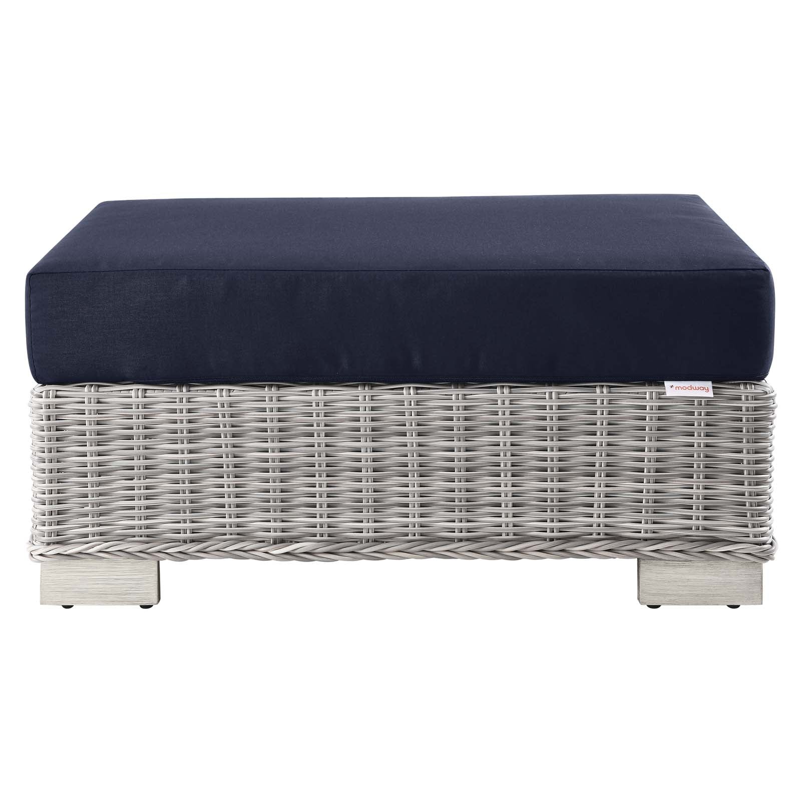 Enjoy fresh air and alfresco relaxation with the Conway Outdoor Patio Wicker Rattan Ottoman. Wrapped in UV-resistant light gray synthetic wicker rattan, this patio ottoman boasts organic texture and a neutral hue that brings a calming presence to your outdoor space. The frame of this outdoor ottoman is crafted with durable powder-coated aluminum and rests on L-shaped legs with plastic foot glides. A thick foam padded cushion covered with a removable, water-resistant polyester cover offers a comfortable seat and affixes securely to the ottoman with a cord tension attachment. Trending aesthetics and a classic design define this outdoor patio furniture collection making it a beautiful addition to any outdoor space including the backyard, patio, porch, balcony, or poolside. Assembly required. Patio Ottoman Weight Capacity: 300 lbs.