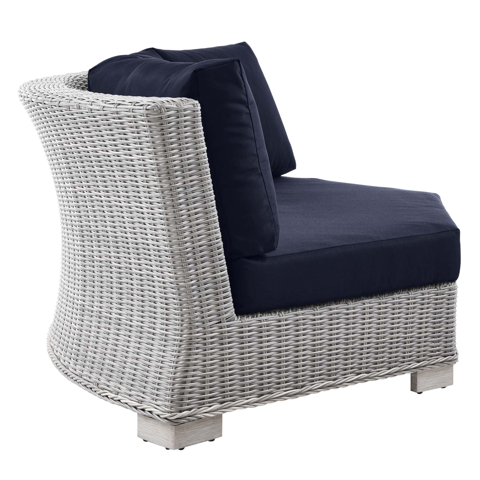 Enjoy fresh air and alfresco relaxation with the Conway Outdoor Patio Wicker Rattan Sectional Sofa Round Corner Chair. Wrapped in UV-resistant light gray synthetic wicker rattan, this sectional sofa piece boasts organic texture, rounded back, and a neutral hue that brings a calming presence to your outdoor area with a modular design that adapts to variety of configurations to suit your space. The frame of this outdoor chair is crafted with durable powder-coated aluminum and rests on L-shaped legs with plastic foot glides. Thick foam padded cushions covered with removable, water-resistant polyester covers offer a comfortable seat and affix securely to the corner chair with cord tension attachments. Trending aesthetics and a classic design define this outdoor patio furniture collection making it a beautiful addition to any outdoor space including the backyard, patio, porch, balcony, or poolside. Assembly required. Patio Corner Chair Weight Capacity: 600 lbs.