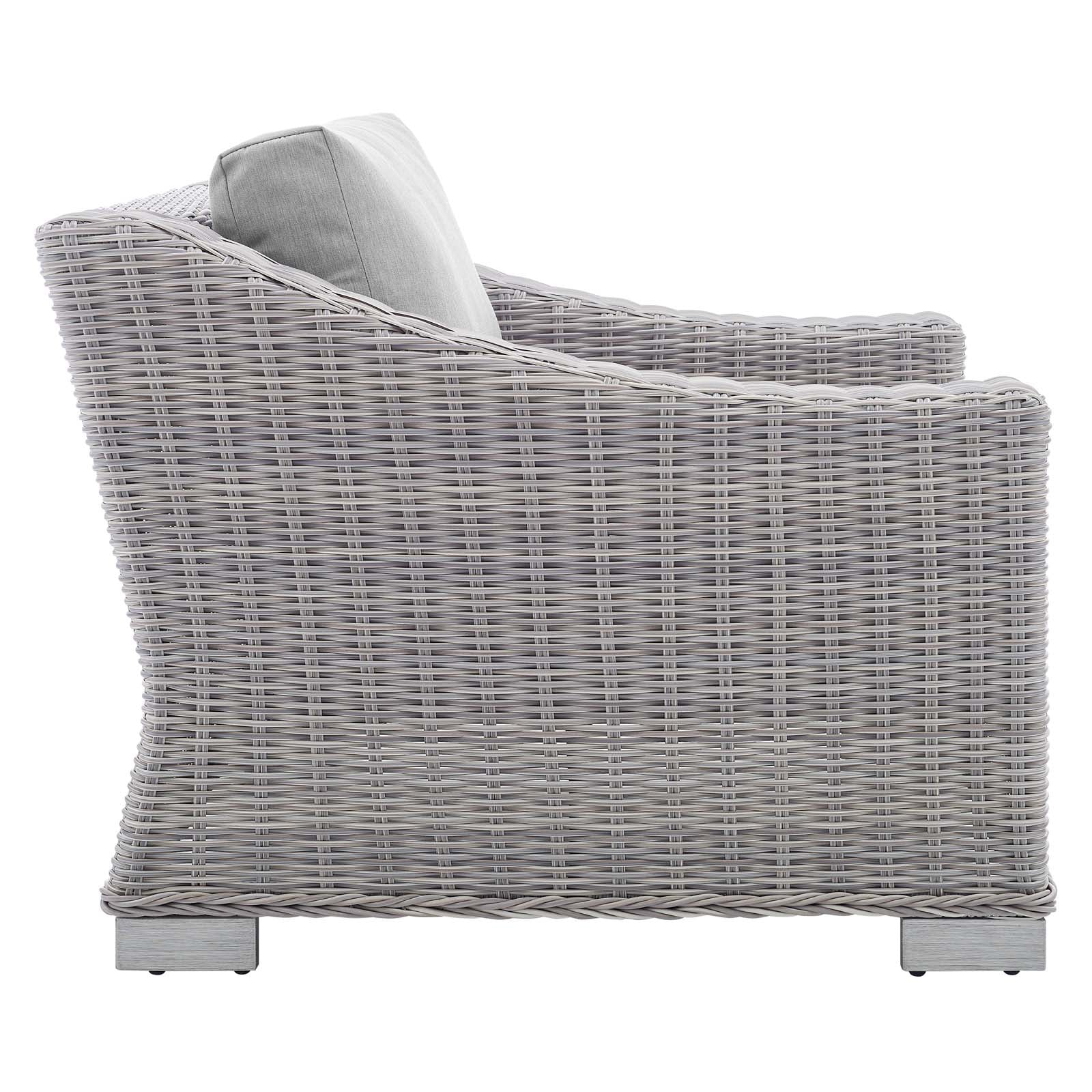 Enjoy fresh air and alfresco relaxation with the Conway Outdoor Patio Sunbrella® Wicker Rattan 2-Piece Armchair and Ottoman Set. Wrapped in UV-resistant light gray synthetic wicker rattan, this patio chair and ottoman set boasts organic texture and a neutral hue that brings a calming presence to your outdoor space. The frame of this outdoor chair and outdoor ottoman are crafted with durable powder-coated aluminum and rest on L-shaped legs with plastic foot glides. Thick foam padded cushions covered with washable water-resistant Sunbrella® fabric covers offer a comfortable seat and affix securely to the lounge chair with cord tension attachments. Trending aesthetics and a classic design define this outdoor patio furniture collection making it a beautiful addition to any outdoor space including the backyard, patio, porch, balcony, or poolside. Assembly required. Patio Chair Weight Capacity: 300 lbs. Patio Ottoman Weight Capacity: 300 lbs.