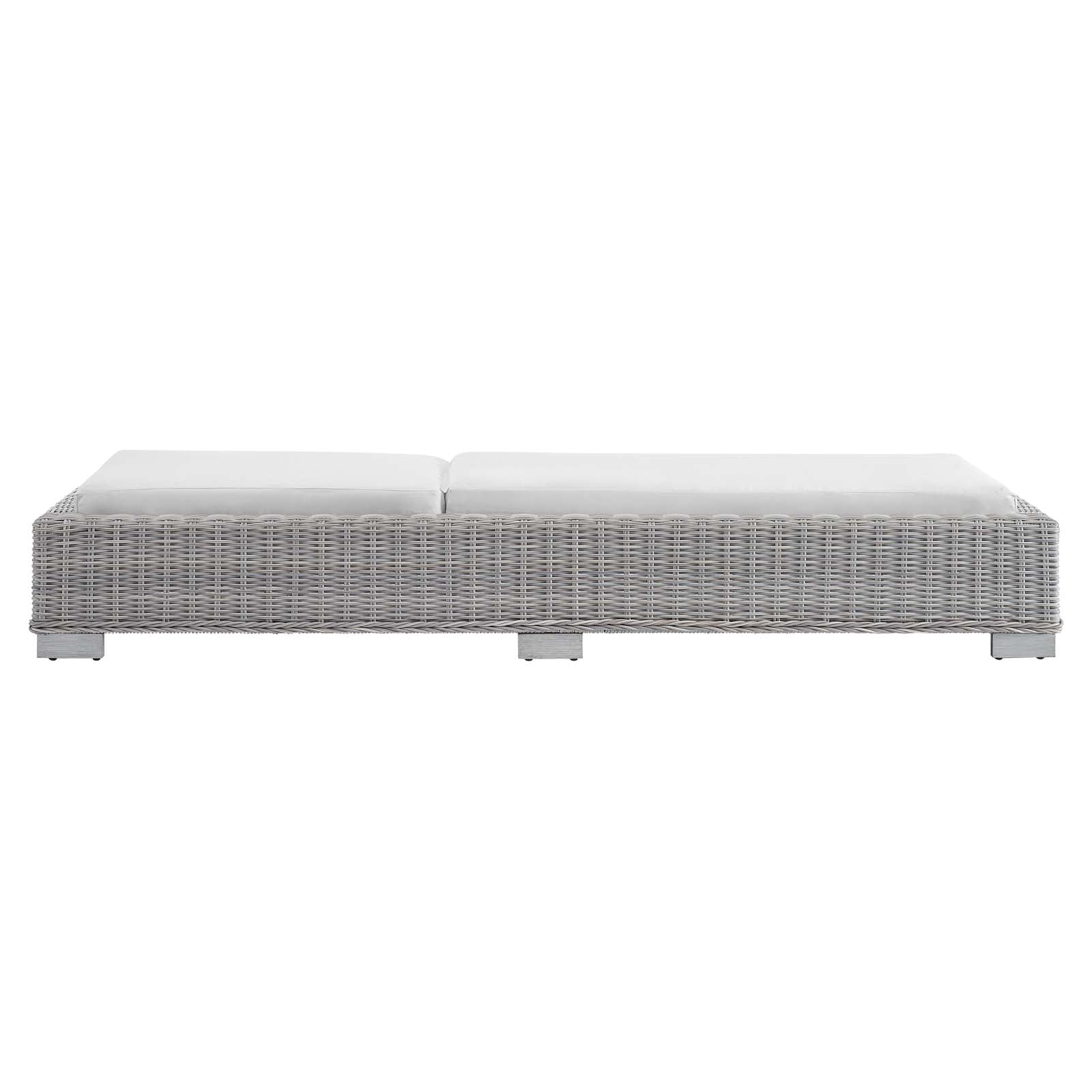 Enjoy fresh air and alfresco relaxation with the Conway Outdoor Patio Wicker Rattan Chaise Lounge Chair. Wrapped in UV-resistant light gray synthetic wicker rattan, this lounge chair boasts organic texture and a neutral hue that brings a calming presence to your outdoor space. With four different recline positions, the frame of this outdoor chaise lounge is crafted with durable powder-coated aluminum and rests on L-shaped legs with plastic foot glides. Thick foam padded cushions covered with washable water-resistant Sunbrella® fabric covers offer a comfortable seat and affix securely to the lounge chair with cord tension attachments. Trending aesthetics and a classic design define this outdoor patio furniture collection making it a beautiful addition to any outdoor space including the backyard, patio, porch, balcony, or poolside. Assembly required. Chaise Lounge Weight Capacity: 600 lbs. Set Includes: One - Conway Sunbrella® Chaise Lounge
