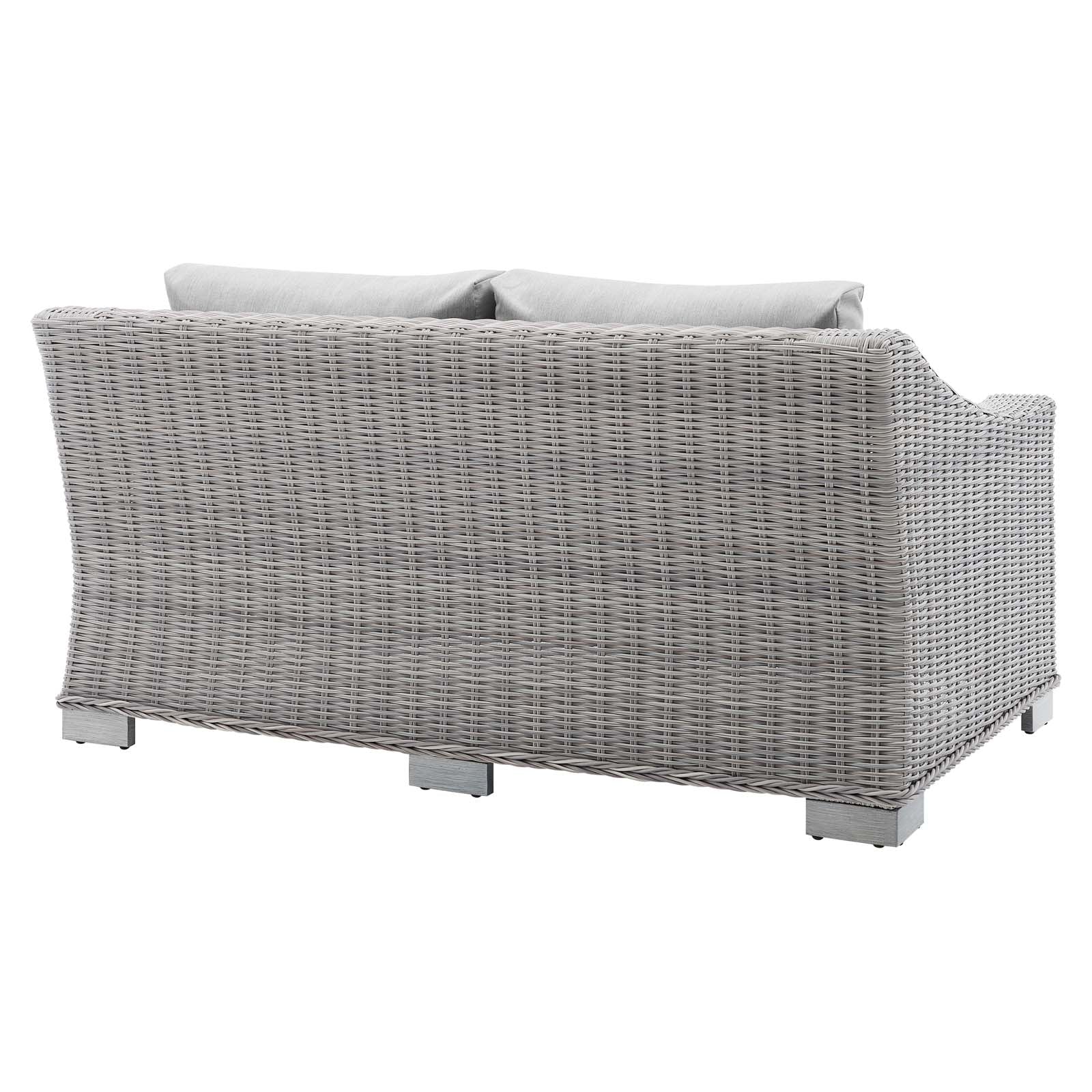 Enjoy fresh air and alfresco relaxation with the Conway Outdoor Patio Wicker Rattan Loveseat. Wrapped in UV-resistant light gray synthetic wicker rattan, this patio loveseat boasts organic texture and a neutral hue that brings a calming presence to your outdoor space. The frame of this outdoor two-seater sofa is crafted with durable powder-coated aluminum and rests on L-shaped legs with plastic foot glides. Thick foam padded cushions covered with washable water-resistant Sunbrella® fabric covers offer a comfortable seat and affix securely to the loveseat with cord tension attachments. Trending aesthetics and a classic design define this outdoor patio furniture collection making it a beautiful addition to any outdoor space including the backyard, patio, porch, balcony, or poolside. Assembly required. Patio Loveseat Weight Capacity: 600 lbs.
