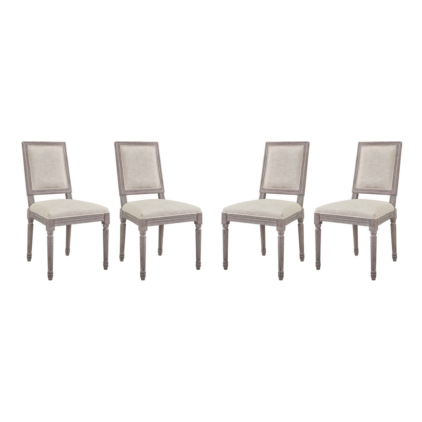 Revel in the whispered opulence of the Court Dining Side Chair. Featuring a fluted wood frame, dense foam upholstered fabric seat with elegant welting, this square back dining or accent chair harmoniously blends old world charm with modern intrigue. Designed with a weathered vintage French look and an undeniable appeal, Court supports up to 331 pounds and comes with foot pads to preserve flooring. Comes fully assembled.
