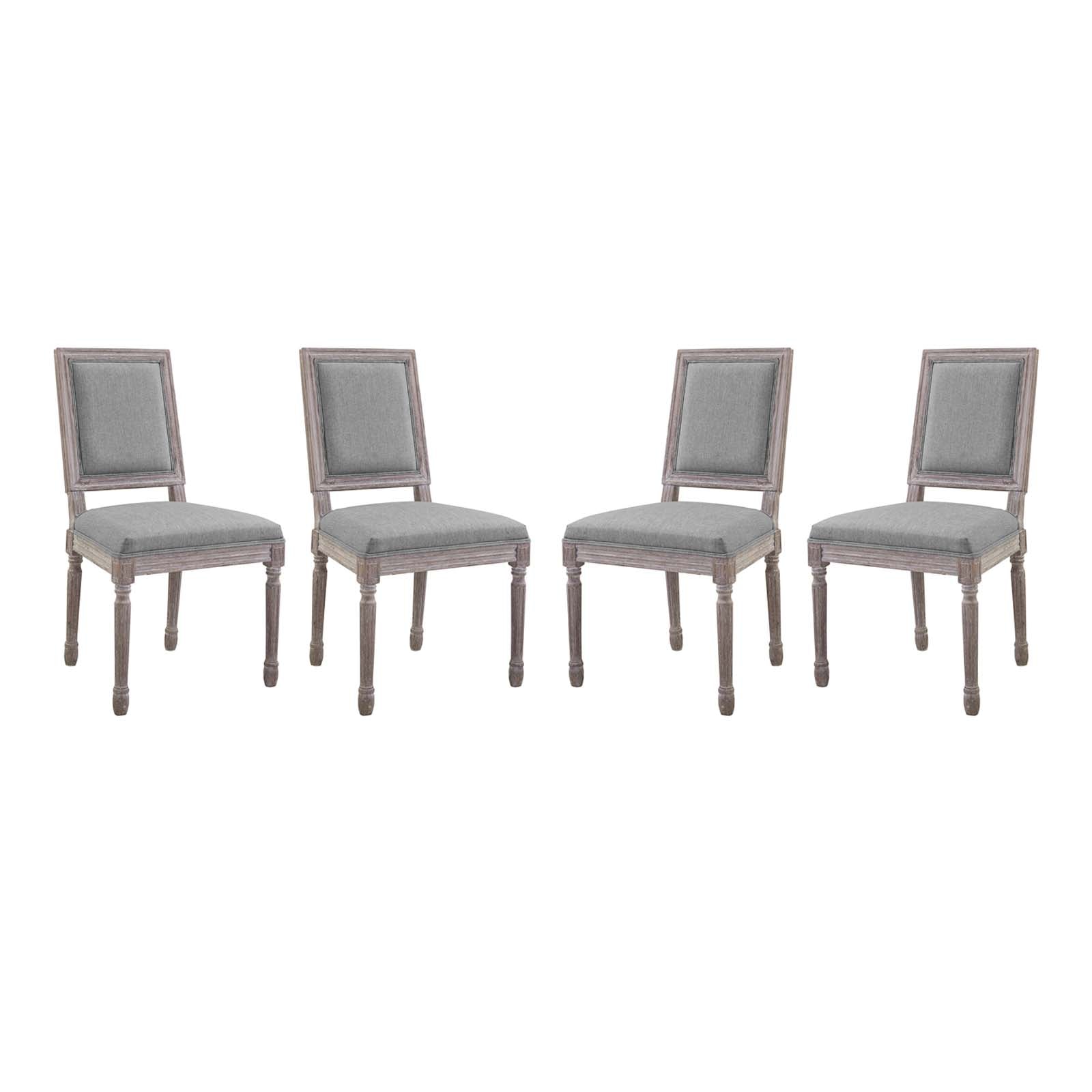 Revel in the whispered opulence of the Court Dining Side Chair. Featuring a fluted wood frame, dense foam upholstered fabric seat with elegant welting, this square back dining or accent chair harmoniously blends old world charm with modern intrigue. Designed with a weathered vintage French look and an undeniable appeal, Court supports up to 331 pounds and comes with foot pads to preserve flooring. Comes fully assembled.