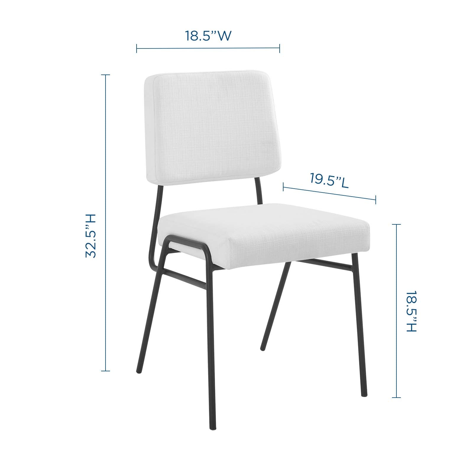 The blended aesthetics of mid-century modern style and the elegance of retro glamour are channeled to create the striking Craft Fabric Upholstered Dining Side Chair. Featuring dual densely padded foam cushions covered in soft and durable polyester fabric upholstery, this dining chair is a luxurious seating experience with an open, breathable design. The Craft Accent Chair sits on an eye-catching matte black stainless steel frame with flared rear legs and non marking foot caps elevating your dining room, lounge room, and office decor. Chair Weight Capacity: 330 lbs. Comes Fully Assembled.