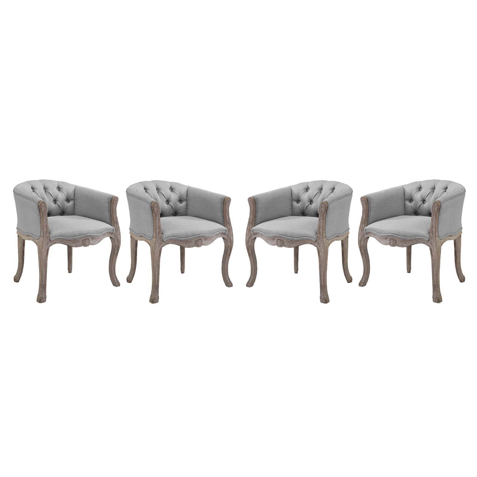 Revel in the whispered opulence of the Crown Dining Armchair. Featuring a fluted wood frame with elegant cabriole legs, dense foam upholstered fabric seat and backrest with welting and button tufting, this round barrel back dining or accent chair harmoniously blends old world charm with modern intrigue. Designed with a weathered vintage French look and an undeniable appeal, Crown supports up to 331 pounds and comes with foot pads to preserve flooring. Comes fully assembled.