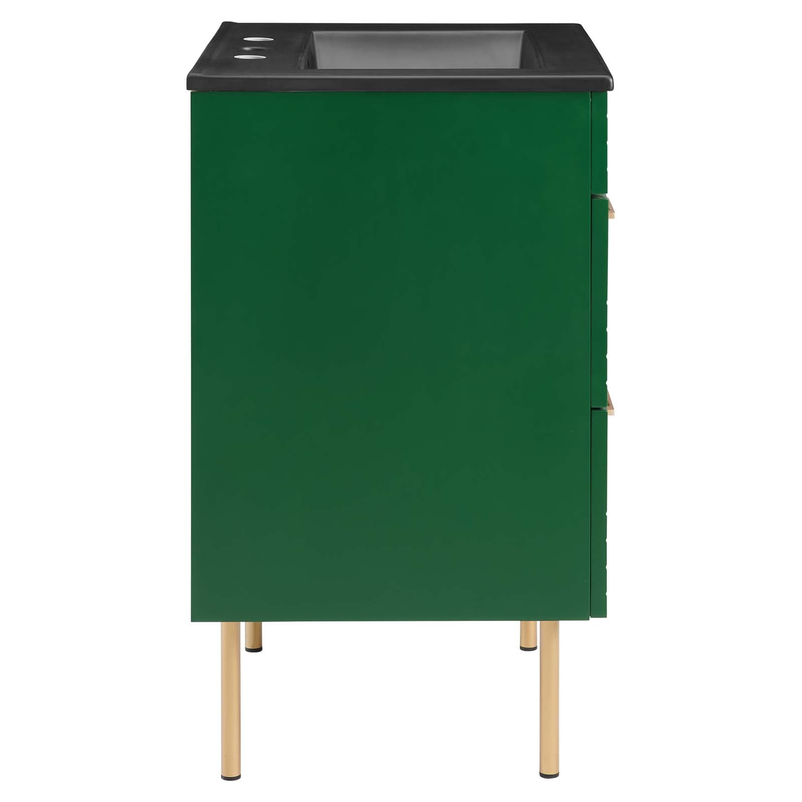Refresh your bathroom space with the contemporary style of the Daybreak 24" Bathroom Vanity. Featuring a modern silhouette, sophisticated matte finish, and brushed gold metal hardware, this vanity is durably crafted with a blend of rubberwood, MDF, and particleboard to create a lasting vanity for your bathroom. Raised off the ground by gold metal legs, this bathroom vanity is complete with ample storage in its spacious drawers to accommade bathroom essentials and features a special design for plumbing. The vanity comes with a ceramic sink basin with 8-inch centerset holes and an integrated countertop. Includes non-marking foot caps. Assembly required. Fixtures not included. Set Includes: One - Daybreak 24" Bathroom Vanity