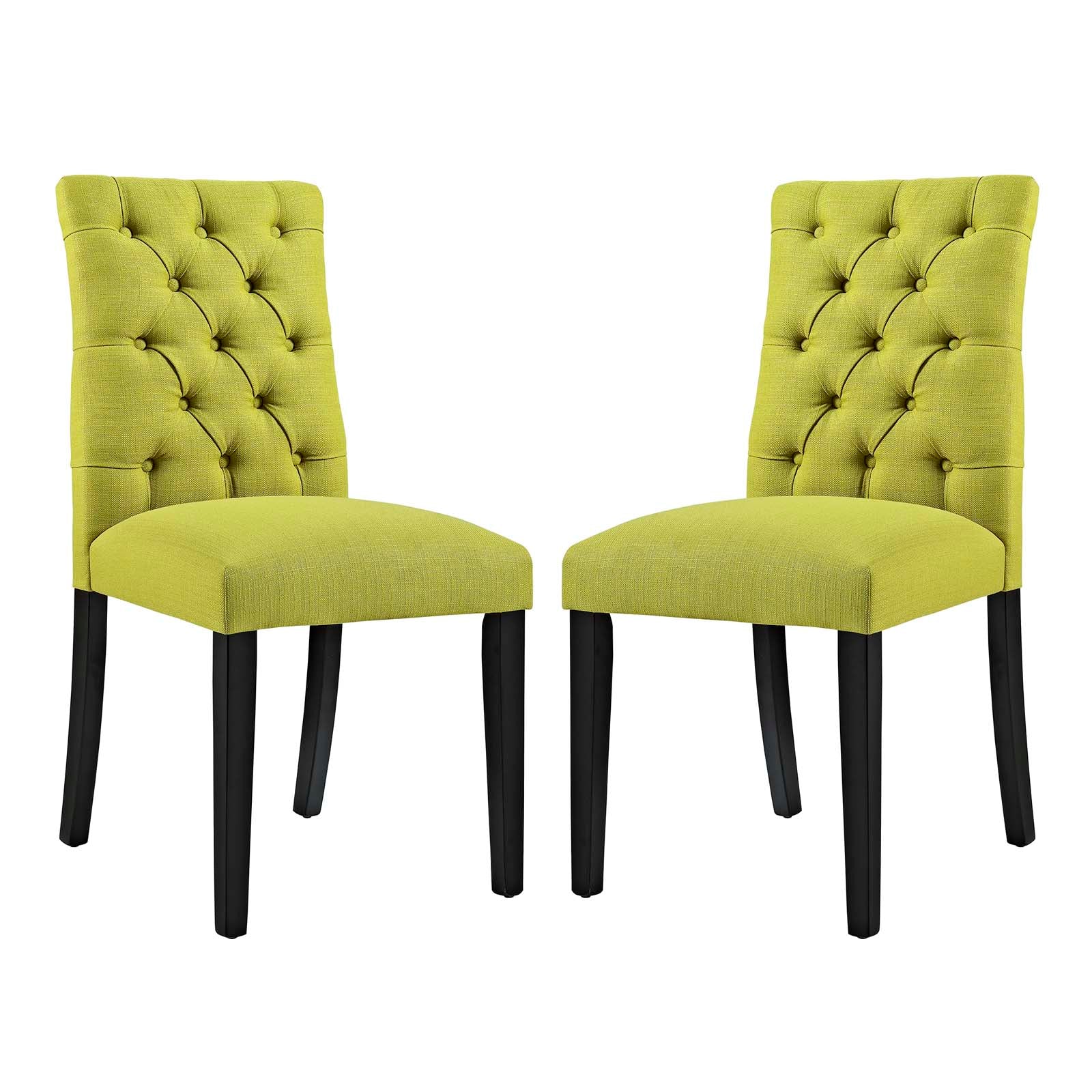 Bestow elegance with the Duchess Dining Chair. Chic and luxurious, Duchess features a stylish curvy form, richly tufted button back, dense foam padding, fine fabric upholstery, and wood legs topped with non-marking foot caps. Resonate grace and charm with a dining chair perfect for the modern home.