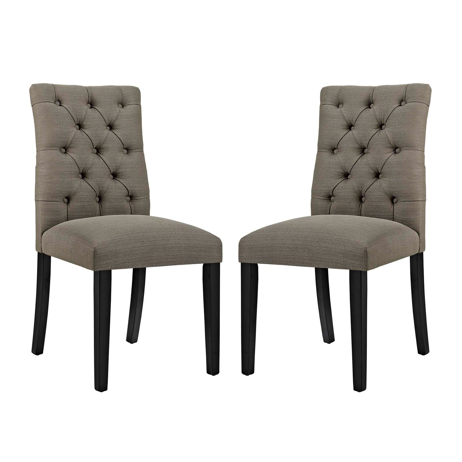 Bestow elegance with the Duchess Dining Chair. Chic and luxurious, Duchess features a stylish curvy form, richly tufted button back, dense foam padding, fine fabric upholstery, and wood legs topped with non-marking foot caps. Resonate grace and charm with a dining chair perfect for the modern home.