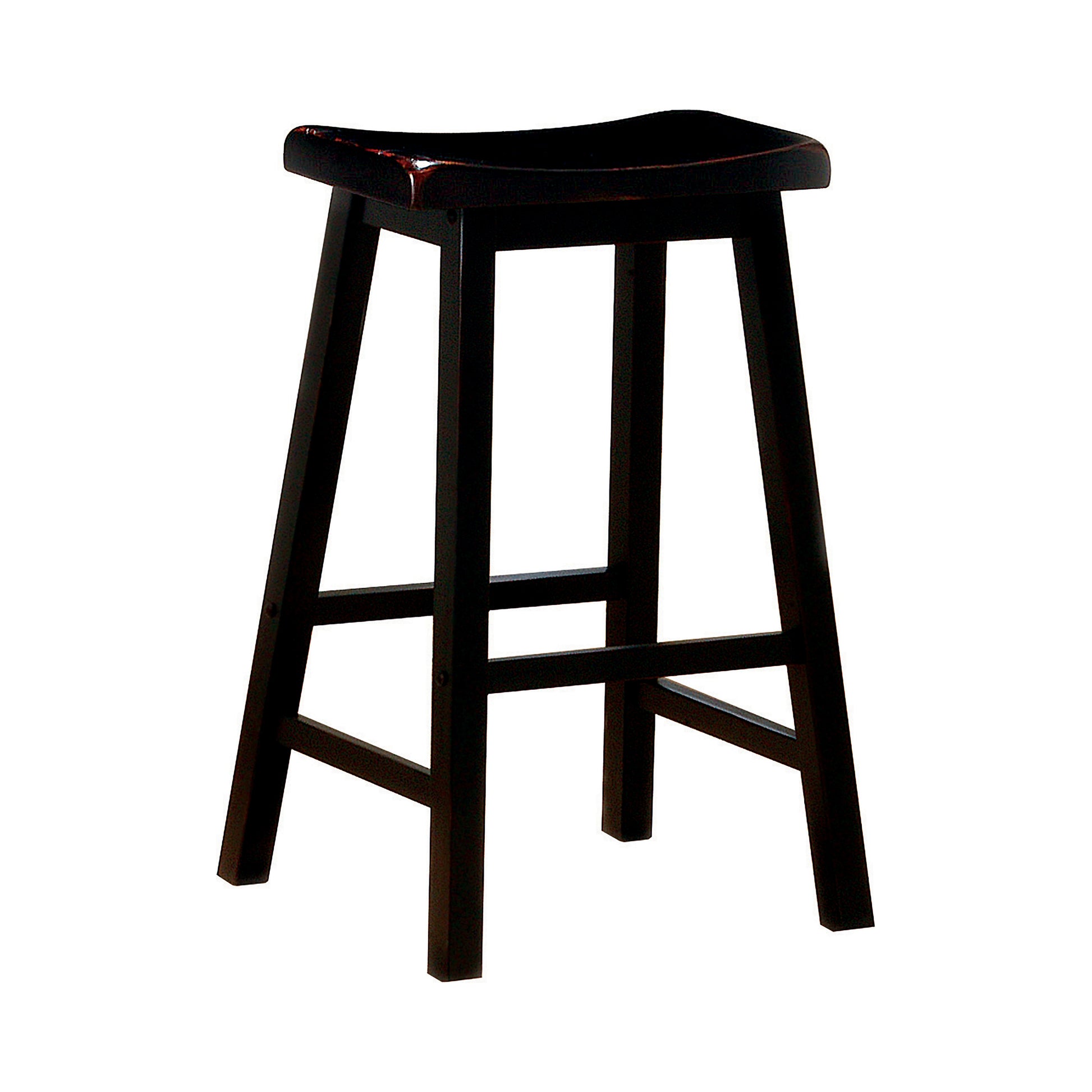 Round out your favorite seating space with the subdued sophistication of this bar height stool. Showcasing a saddle seat design, its bold, black finish blends seamlessly with a variety of color palettes. Four long, sleek legs flare out elegantly to create an inspired silhouette. Its foot pedestals are arranged in varying heights to help kids and adults of all sizes feel comfortably relaxed. This stool creates a functional and eye-catching accent to any room.