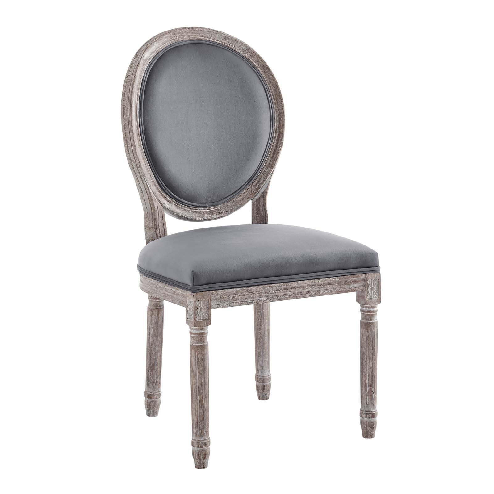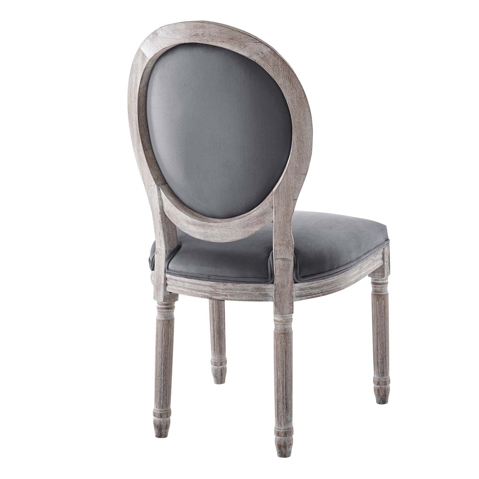 Revel in the whispered opulence of the Emanate Dining Side Chair. Featuring a fluted wood frame, dense foam upholstered performance velvet seat with elegant welting, this oval back dining or accent chair elegantly blends old world charm with modern intrigue. Designed with a weathered vintage French look and an undeniable appeal, Emanate supports up to 331 pounds and comes with foot pads to preserve flooring. Comes fully assembled.