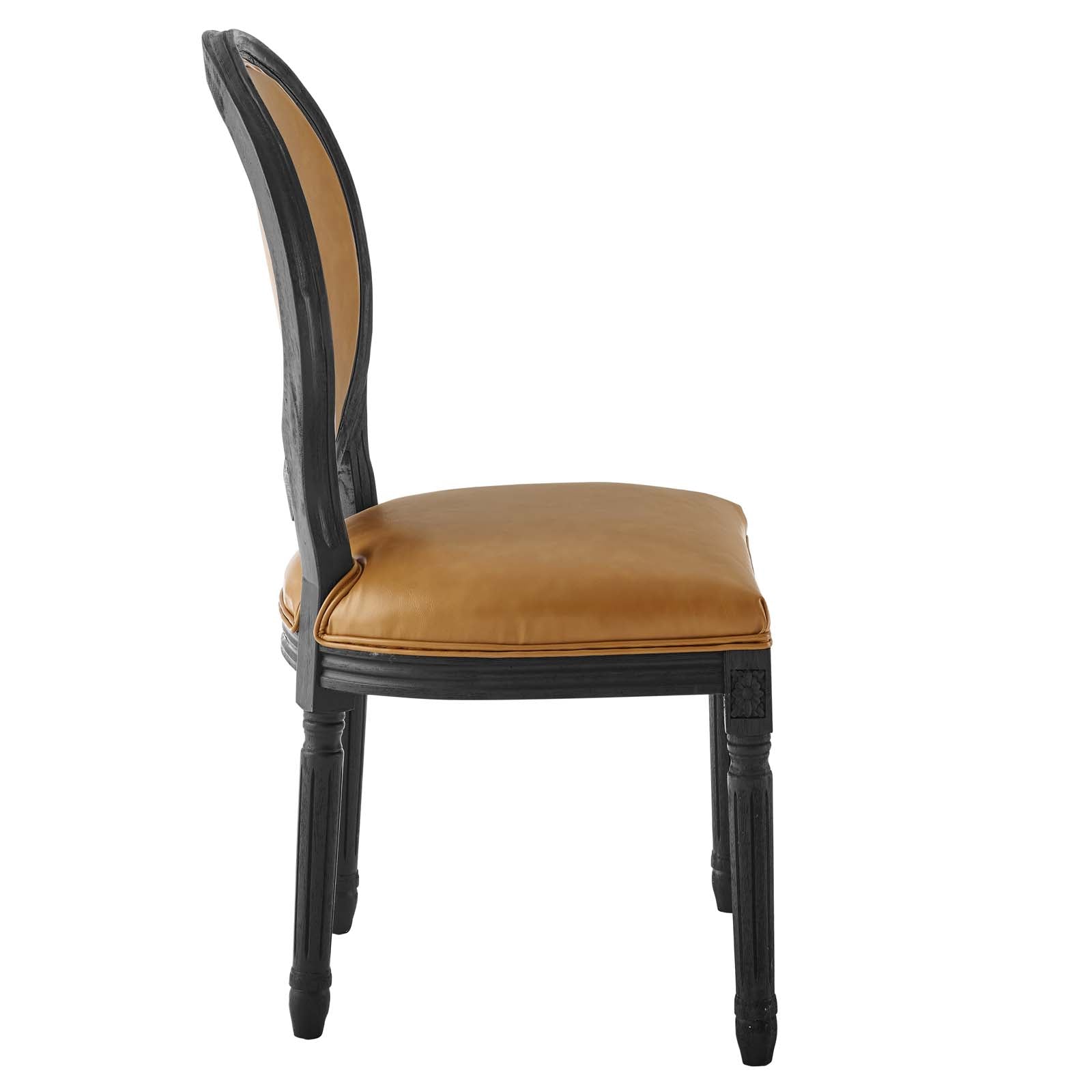 Revel in the whispered opulence of the Emanate Dining Side Chair. Featuring a fluted wood frame, dense foam upholstered vegan leather seat with elegant welting, this oval back dining or accent chair elegantly blends old world charm with modern intrigue. Designed with a weathered vintage French look and an undeniable appeal, Emanate supports up to 331 pounds and comes with foot pads to preserve flooring. Comes fully assembled.