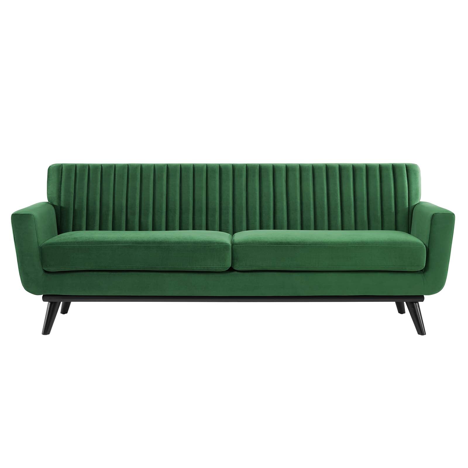 Gently sloping curves and plush seat cushion create a favorite lounging spot. Whether relaxing after a long day at work, settling in with coffee and brunch, or entering a spirited discussion with friends, the Engage Sofa is a welcome presence in your home. Channel tufting creates eye-catching appeal, adding depth that brings your sitting décor to center stage. The black painted rubberwood legs and frame offer a solid base for the stain-resistant performance velvet upholstery.