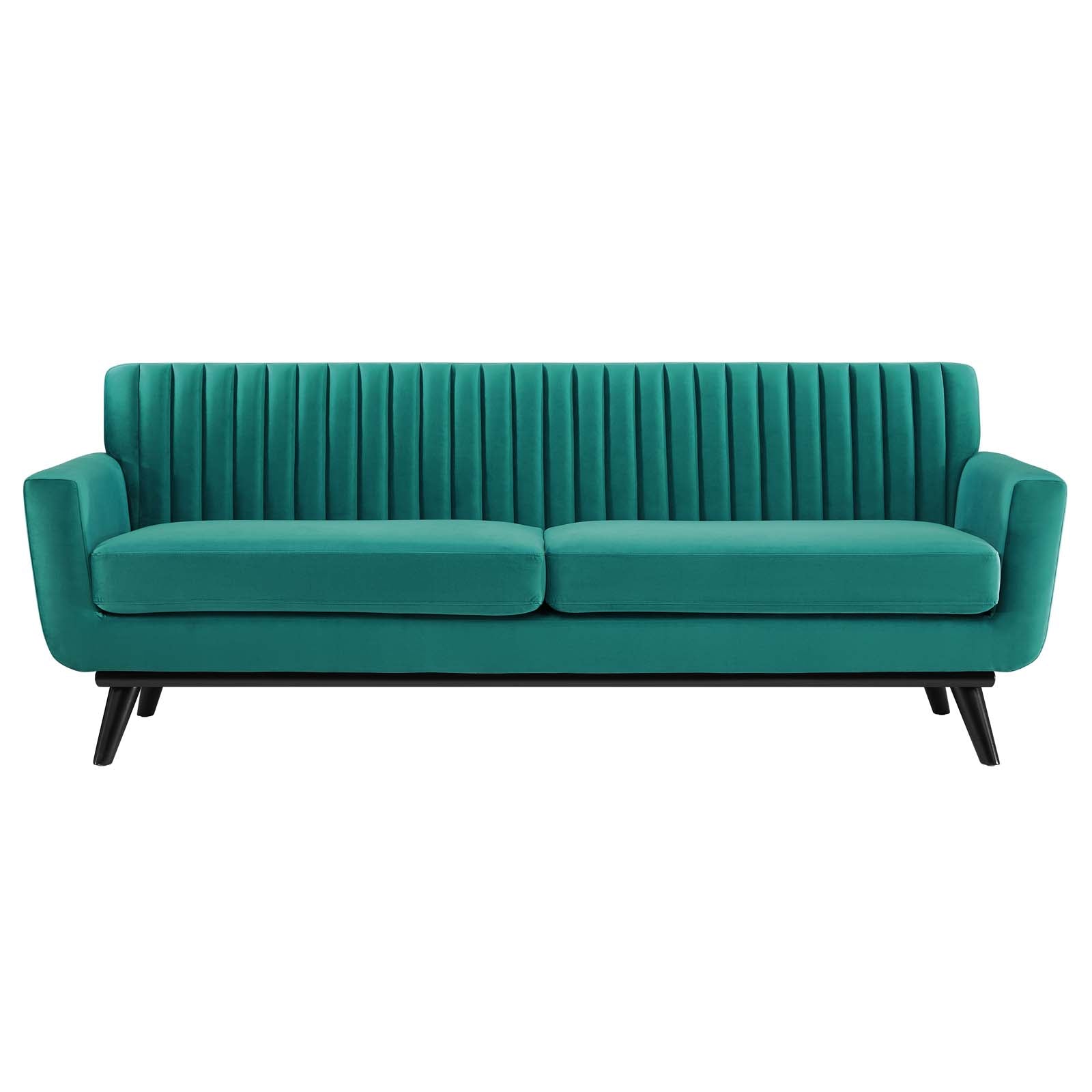Gently sloping curves and plush seat cushion create a favorite lounging spot. Whether relaxing after a long day at work, settling in with coffee and brunch, or entering a spirited discussion with friends, the Engage Sofa is a welcome presence in your home. Channel tufting creates eye-catching appeal, adding depth that brings your sitting décor to center stage. The black painted rubberwood legs and frame offer a solid base for the stain-resistant performance velvet upholstery.