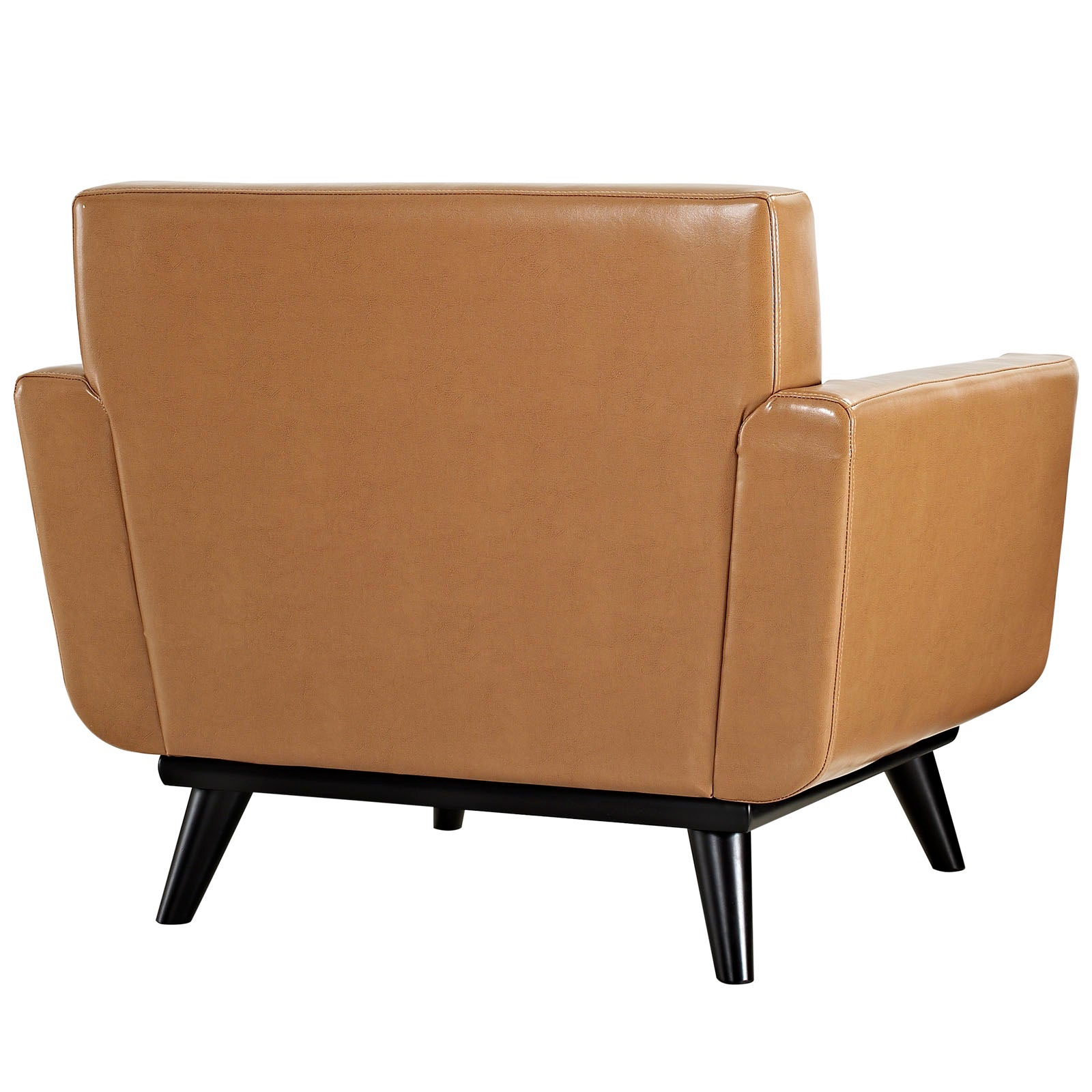 Gently sloping curves and large dual cushions create a favorite lounging spot. Whether plopping down after a long day at work, settling in with coffee and brunch, or entering a spirited discussion with friends, the Engage armchair is a welcome presence in your home. Three buttons create eye-catching appeal, adding depth that brings your sitting décor to center stage. Four rubberwood legs and frame supply a solid base to the comfortable quality leather.