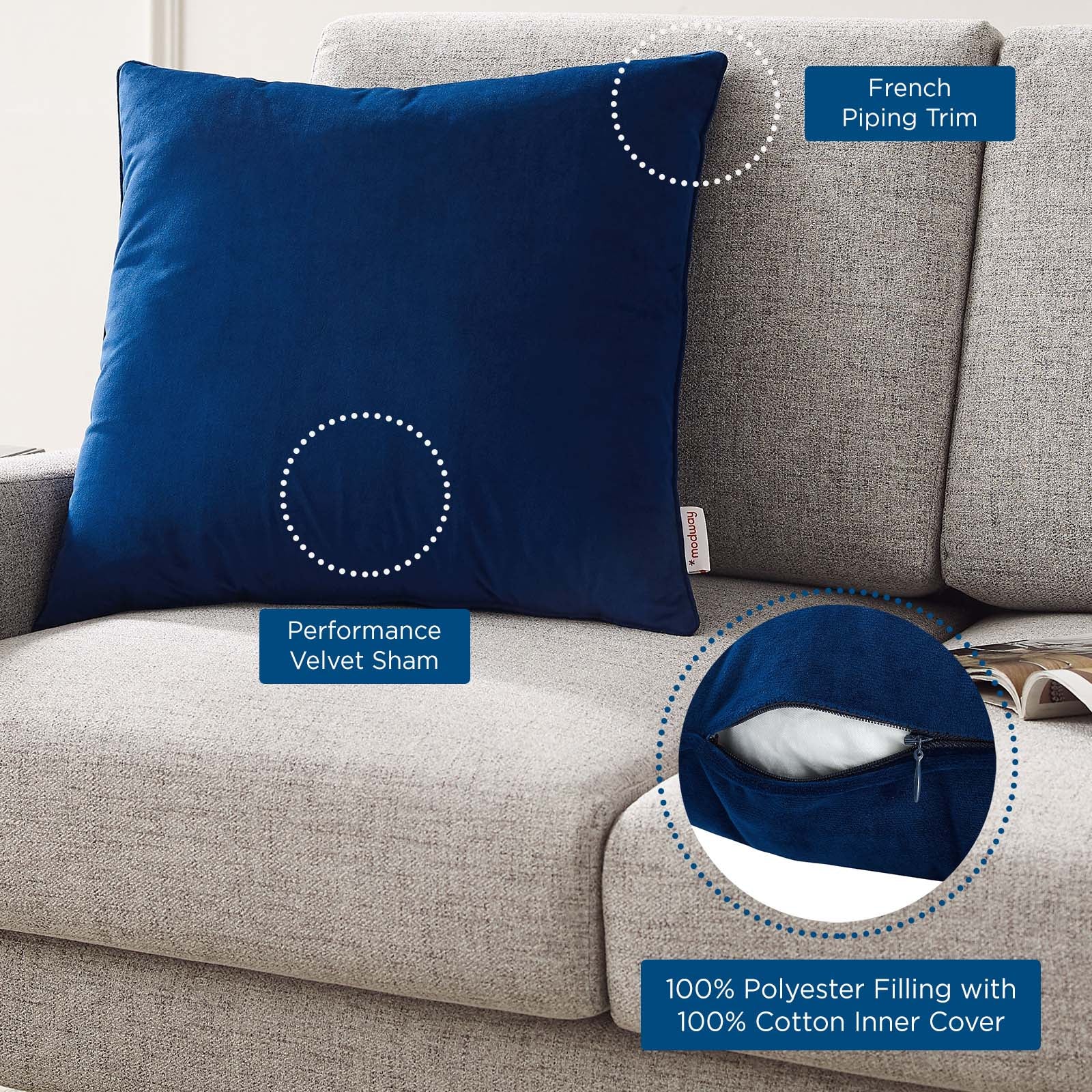 Incorporate a pop of color and texture into your home decor with the Enhance Performance Velvet Throw Pillow. With French piping along the edges, this accent pillow is perfect for a sofa, loveseat, armchair, bench, or bed. Bringing rich textiles to your living space or bedroom, this accent pillow wears a beautiful performance velvet sham that's soft to the touch. The insert of this square pillow is stuffed with plush polyester filling and complete with a 100% cotton inner cover.