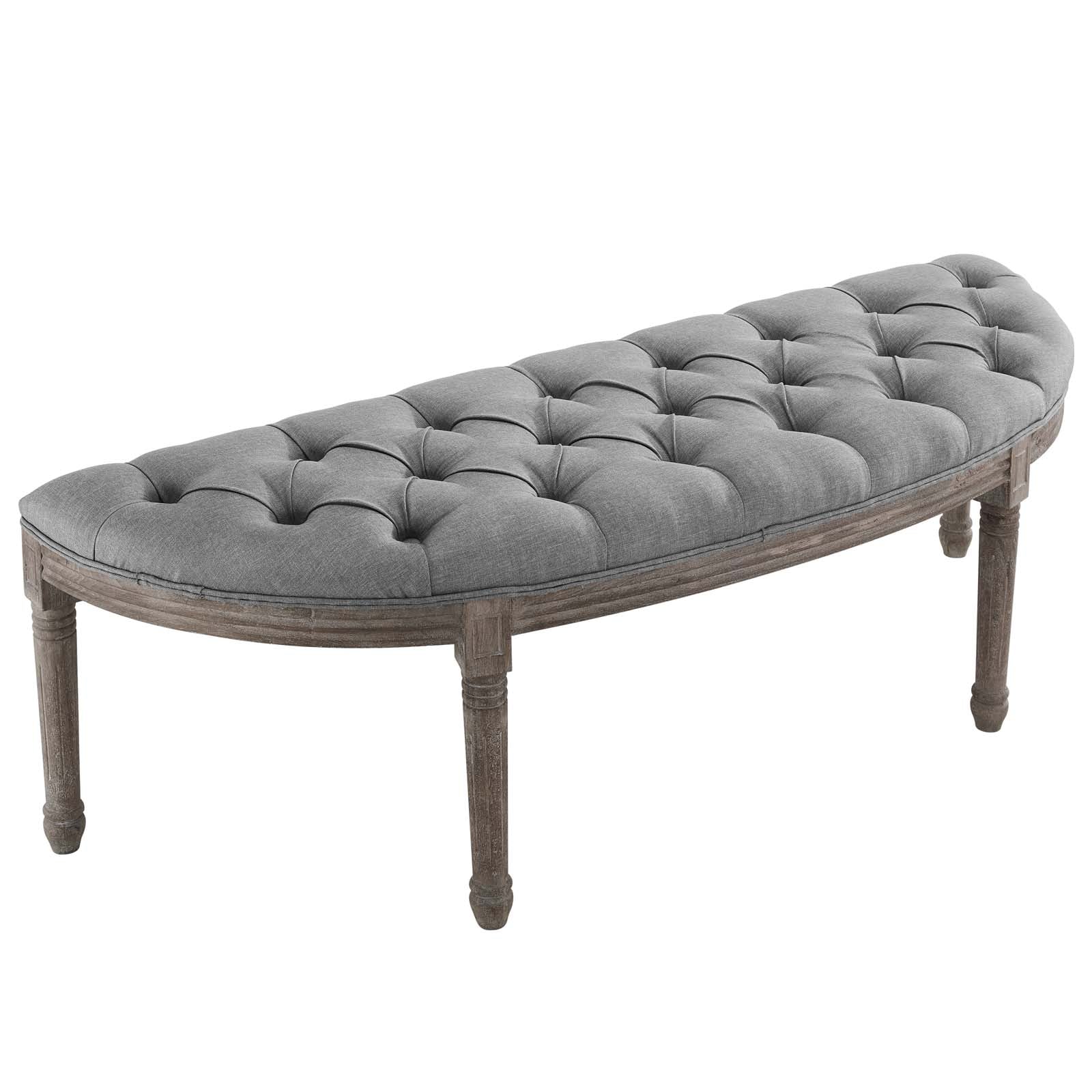 Introduce the elegance of French inspiration and the charm of vintage rustic style with the Esteem Vintage French Upholstered Fabric Bench. Perfect in the bedroom, living room, or entryway foyer, this classic modern bench provides a supportive place to rest in nearly every room of the house. Featuring deep button tufting, carved weathered wood legs, dense foam padding, durable polyester fabric, and a sophisticated semi-circle shape of this timeless accent or entryway bench. Includes foot pads to protect flooring. Bench Weight Capacity: 450 lbs.