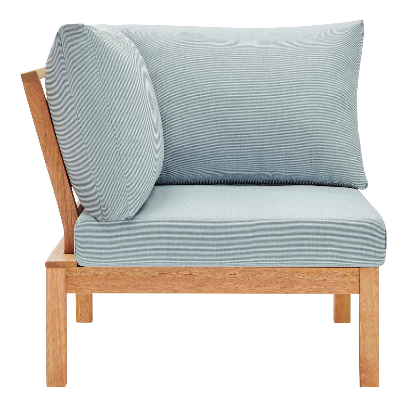 Style your patio and outdoor space with the uniquely configured Freeport Outdoor Patio Sectional Sofa Corner Chair. This FSC certified karri wood outdoor sectional seat has a beautiful natural wood frame. This solidly constructed seat features a gently reclining slatted back for an angle of repose that delivers relaxing outdoor enjoyment. Complete with padded seat and back cushions with soft, all-weather fabric covers, Freeport provides a comfortable lounging space by patio, deck, backyard, or porch. The Freeport Outdoor Patio Sectional Sofa Corner Chair will elevate your outdoor decor with a blend of coastal accents for a fresh, contemporary style. Removable Cushions. Chair Weight Capacity: 331 lbs.