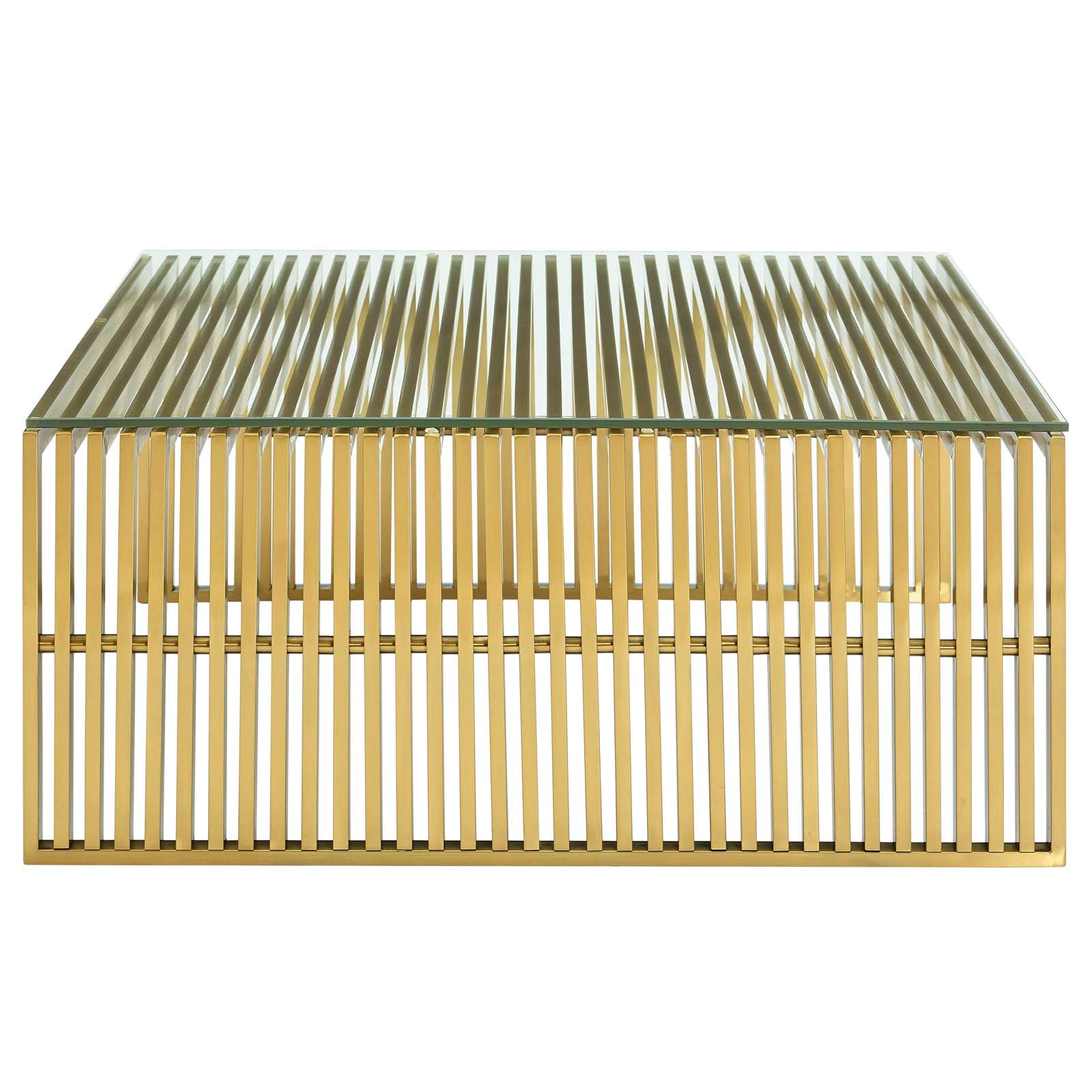 Straight lines were once deemed the realm of strict logic. This conduit design accomplishes something quite profound. It blends linear components with a stylish gold-colored stainless steel tubular effect. Modernism used to be about extremes. Wild shapes and patterns that don’t dare resemble its predecessors. We’ve reached an age of maturity of sorts. We appreciate style, but all the more, we respect those designs that represent a blending of cultures. The Gridiron tubular stainless steel coffee table is famous not for its radical shape, but for the strategic transcendence that it provides. Gridiron is perfect for reception rooms, living and lounge areas, and any other place in need of transformation. Comes fully assembled.
