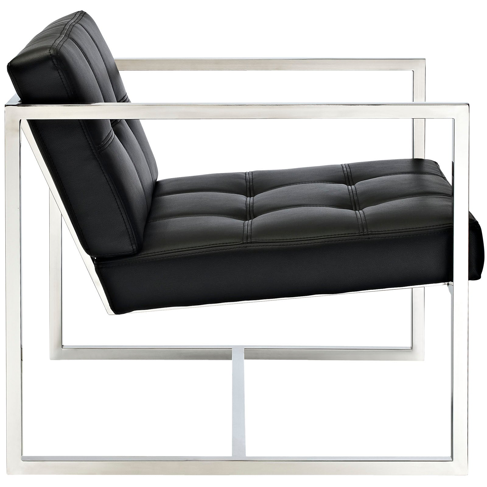 Embrace mid-century elements with this welcoming reception seating chair. Hover is a modern chair, but not for the typical reasons. Its padded vinyl buttoned seat and back and geometric stainless steel frame truly develop space and form in an innovative way. Hover is perfect both for those offices looking to impress new clients and for anyone who ever dreamed of stationary flight.