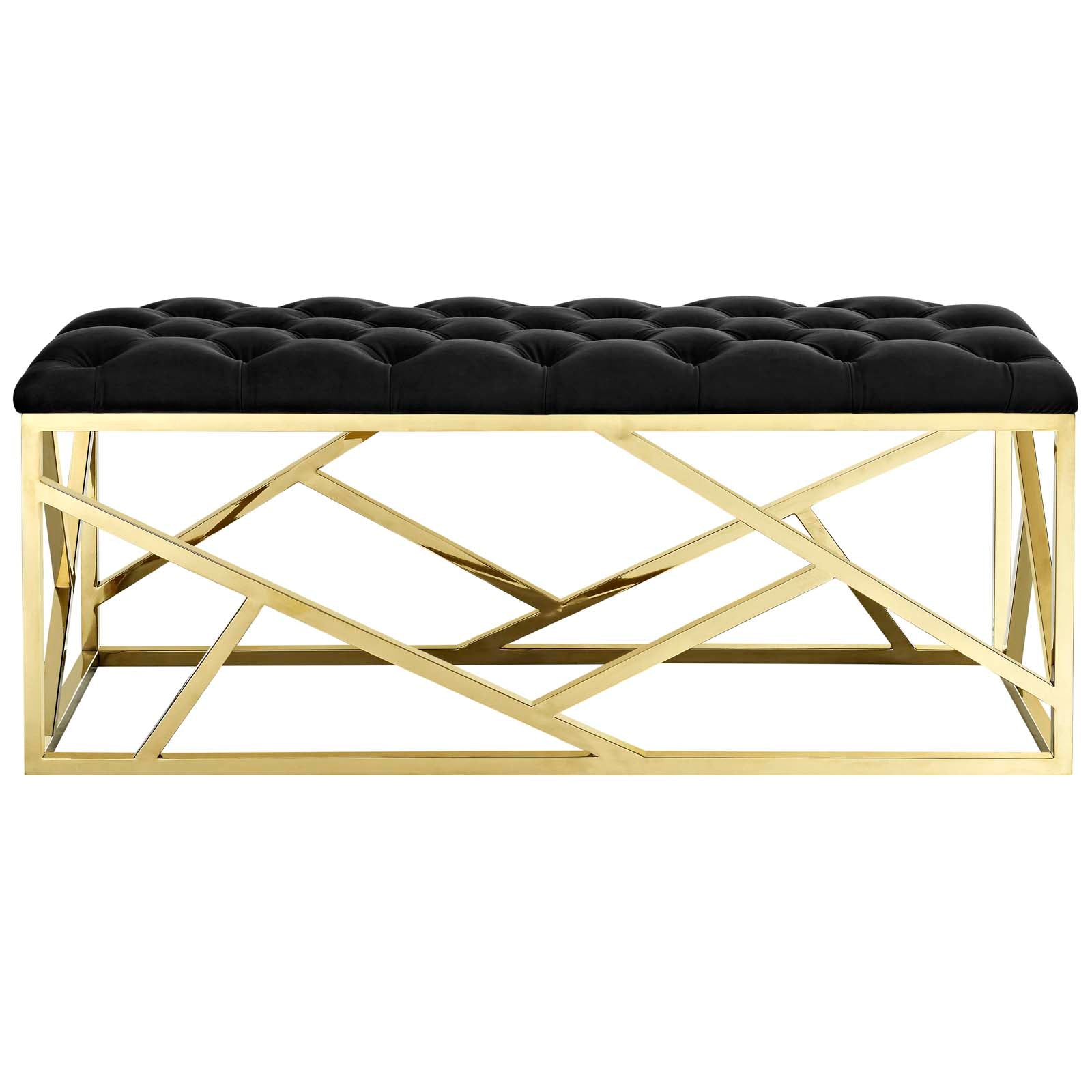 Beautify your decor with the Intersperse Bench. Boasting a captivating design, Intersperse features a polished stainless steel base, a luxuriously tufted velvet polyester fabric top with elegantly tufted buttons, and non-marking footpads that help protect your flooring. A welcome addition to the modern bedroom or living space, Intersperse combines comfort and style with a supportive seat cushion and weight capacity up to 331 lbs. No assembly required.