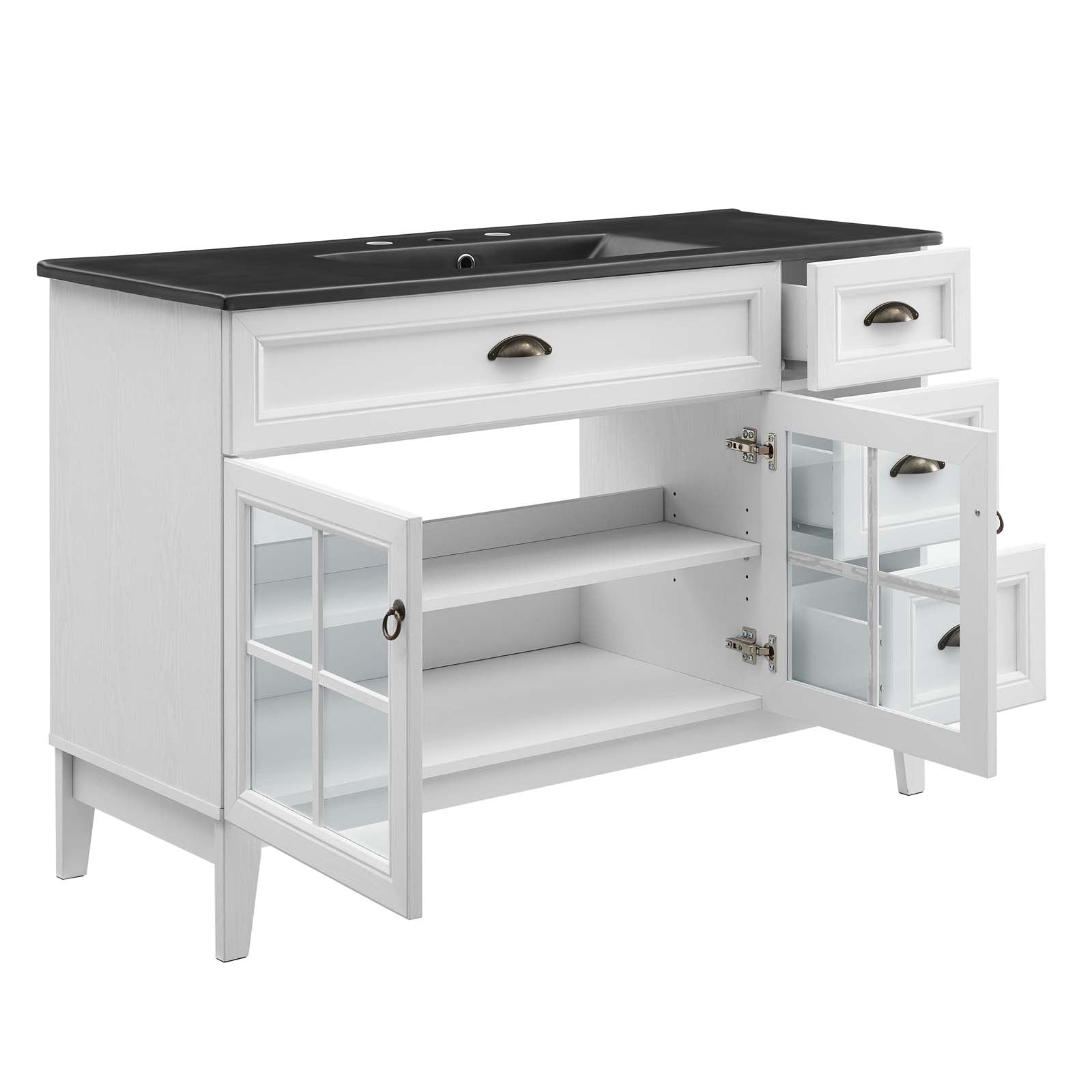 Invite the provincial charm of the Isle 48" Bathroom Vanity Cabinet to transform your bathroom space. Made of sturdy particleboard and MDF, Isle’s coastal contemporary design features a fixed drawer, three side drawers, and an adjustable shelf for under-sink storage behind two glass windowpane doors. A curved ceramic sink basin with an integrated countertop and 8" centerset faucet holes brings stylish functionality to this bathroom vanity. With a solid construction, this bathroom vanity cabinet brings contemporary design and coastal style to your bathroom space. Assembly required and fixtures not included.