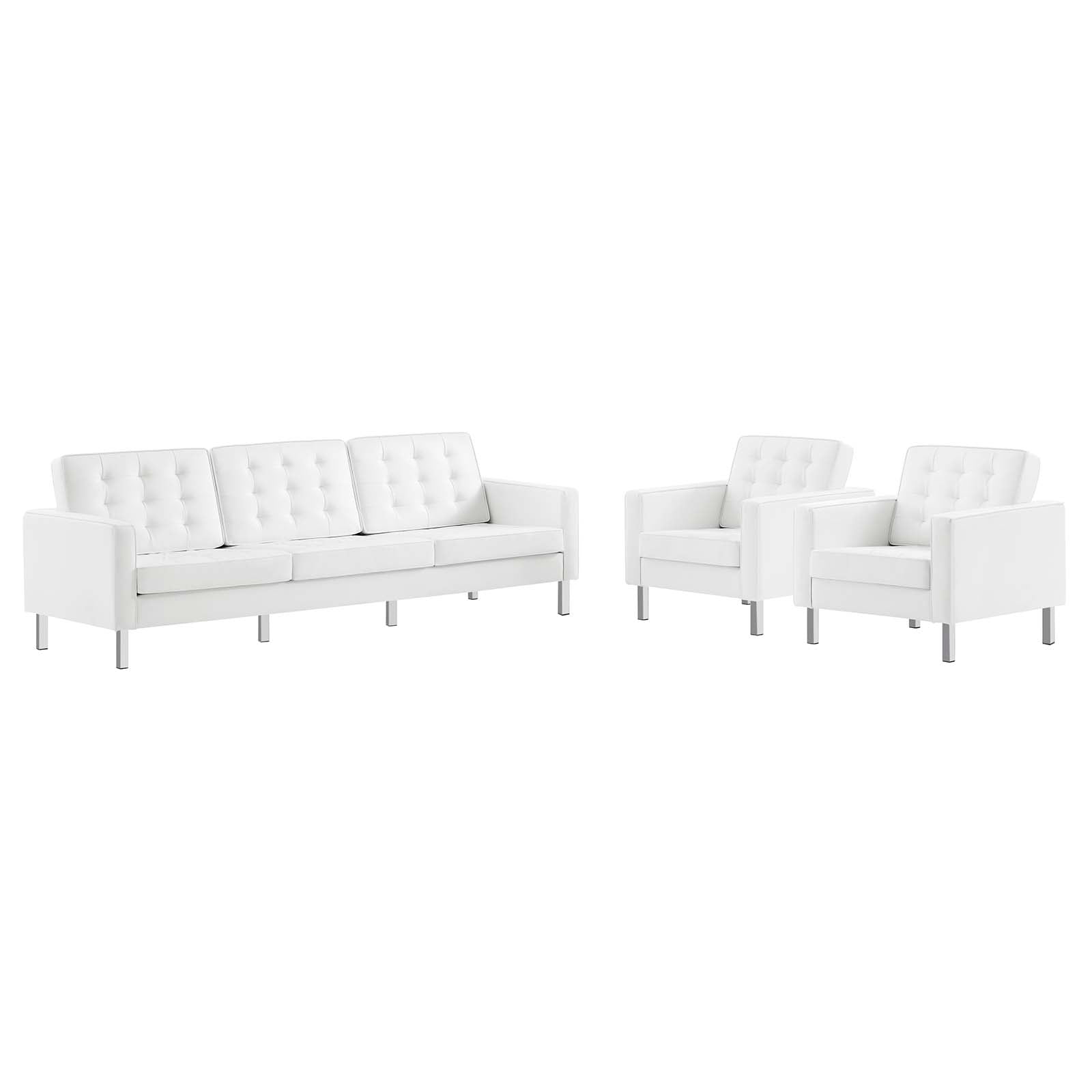 Revolutionize your living room furniture with the iconic Loft Vegan Leather Furniture Set. Adding visual depth to your living room or lounge space, Loft features soft and durable vegan leather upholstery accented with classic biscuit tufting. This modern living room furniture set showcases a captivating linear design, tubular stainless steel legs, and non-marking foot caps that protect flooring. Inspired by the richness of mid-century modern style, this stylish furniture set is the preferred choice of living rooms, office reception areas, and lounge spaces. Assembly required. Set Includes: 2 Armchairs, 1 Sofa