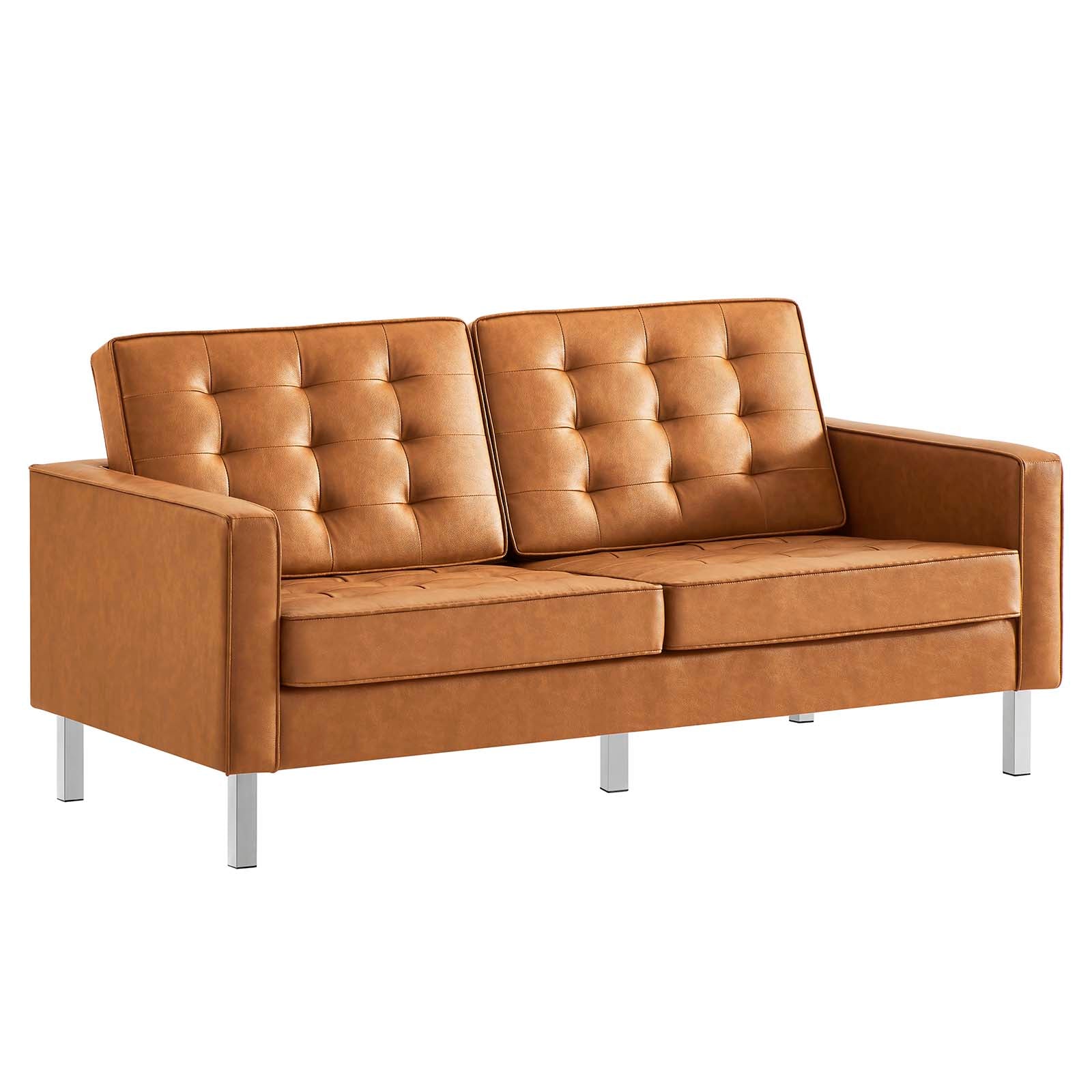 Revolutionize your living room furniture with the iconic Loft Vegan Leather Loveseat. Adding visual depth to your living room or lounge space, Loft features soft and durable vegan leather upholstery accented with classic biscuit tufting. This modern loveseat showcases a captivating linear design, tubular stainless steel legs, and non-marking foot caps that protect flooring. Inspired by the richness of mid-century modern style, this stylish two-seater sofa is the preferred choice of living rooms, office reception areas, and lounge spaces. Loveseat Weight Capacity: 660 lbs.