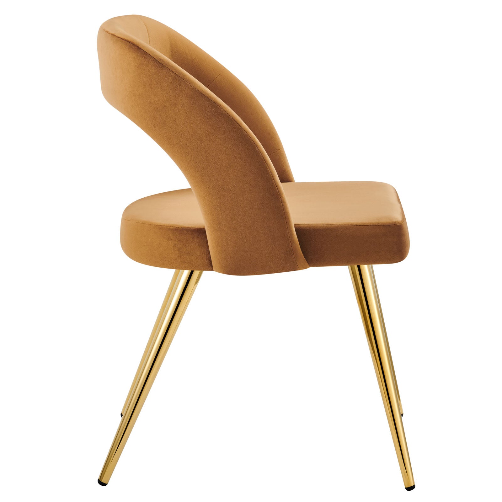The Marciano Performance Velvet Dining Chair displays an understated retro modern elegance complementing mid-century modern, contemporary or transitional decors. This side chair is fortified with dense foam padding for a highly sculpted and welcoming frame and features stain-resistant performance velvet upholstery. The open-arched backrest curves gently inward as it glides downward, connecting to the sides of the seat cushion. The polished gold legs enhance the glam deco aesthetic and trim frame, making this an optimal accent chair in your living room, bedroom, or entryway. This sleek dining chair satisfies with a sturdy gold metal frame, non-marking foot pins, and stain-resistant fabric.