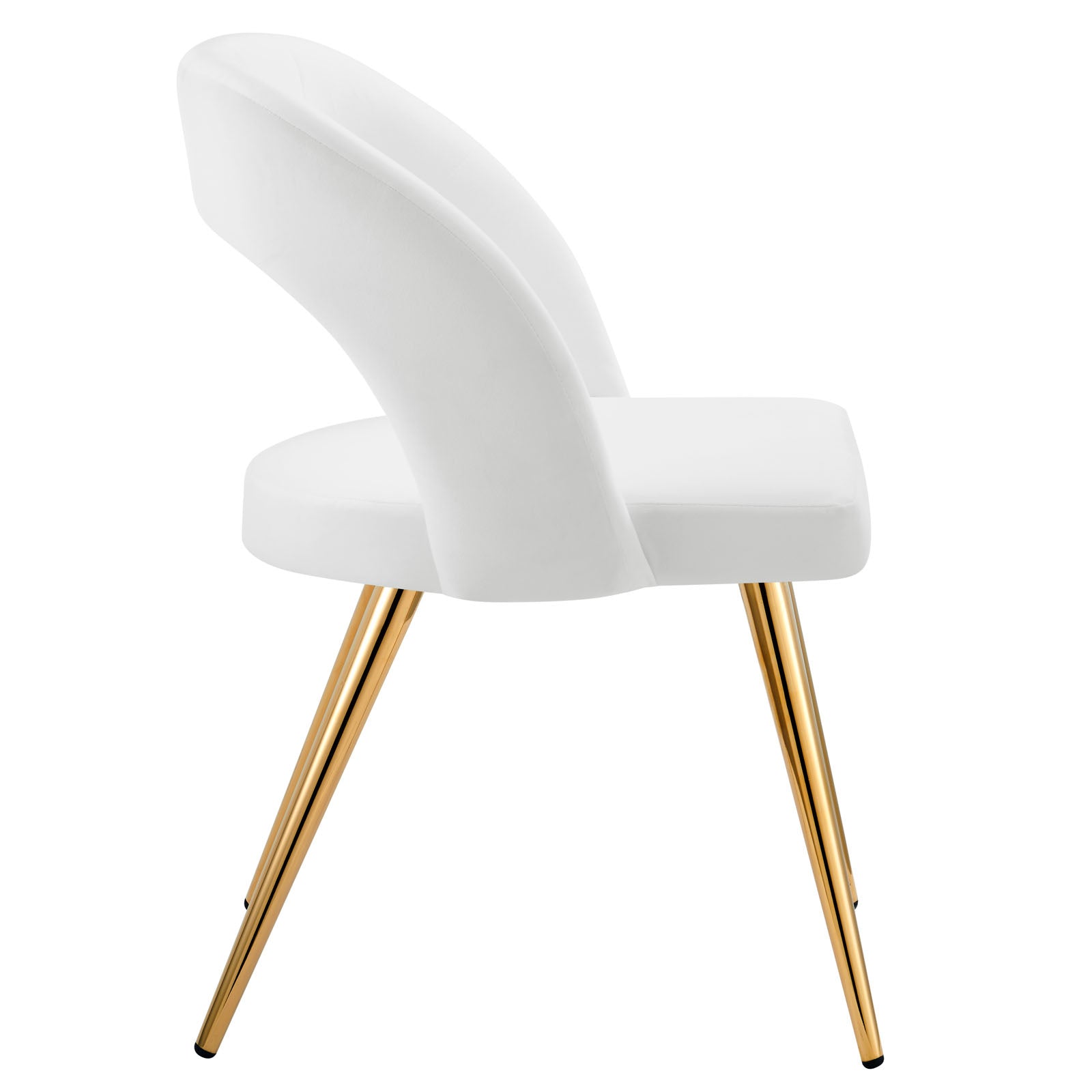 The Marciano Performance Velvet Dining Chair displays an understated retro modern elegance complementing mid-century modern, contemporary or transitional decors. This side chair is fortified with dense foam padding for a highly sculpted and welcoming frame and features stain-resistant performance velvet upholstery. The open-arched backrest curves gently inward as it glides downward, connecting to the sides of the seat cushion. The polished gold legs enhance the glam deco aesthetic and trim frame, making this an optimal accent chair in your living room, bedroom, or entryway. This sleek dining chair satisfies with a sturdy gold metal frame, non-marking foot pins, and stain-resistant fabric.