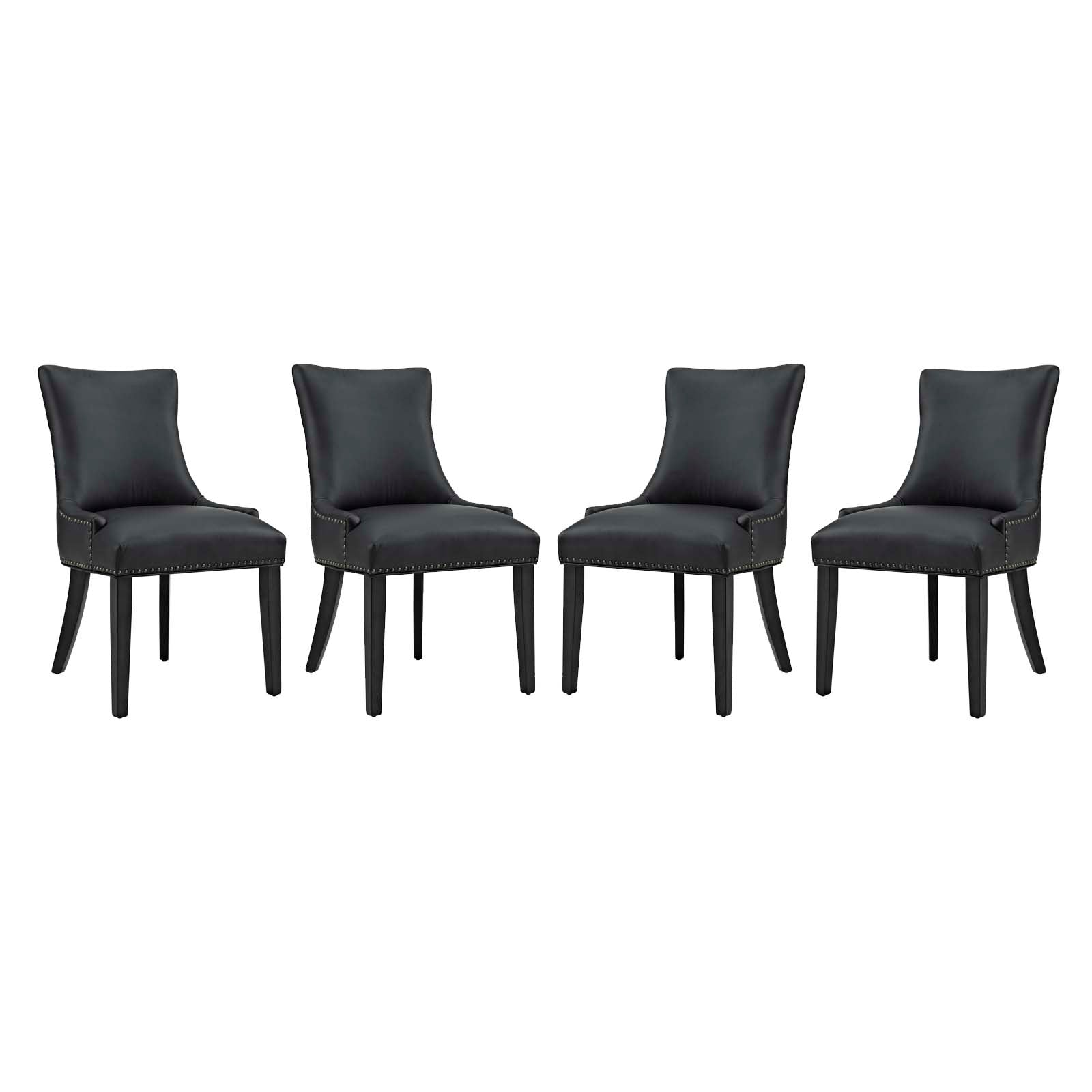 Bequeath distinction with the Marquis Dining Chair. Charm and elegance adorn this luxurious button tufted dining chair complete with sleek curves and antique copper nailhead trim. Featuring dense foam padding, fine vinyl upholstery, solid wood frame, and non-marking foot glides, Marquis is an elegant dining chair perfect for the modern home.