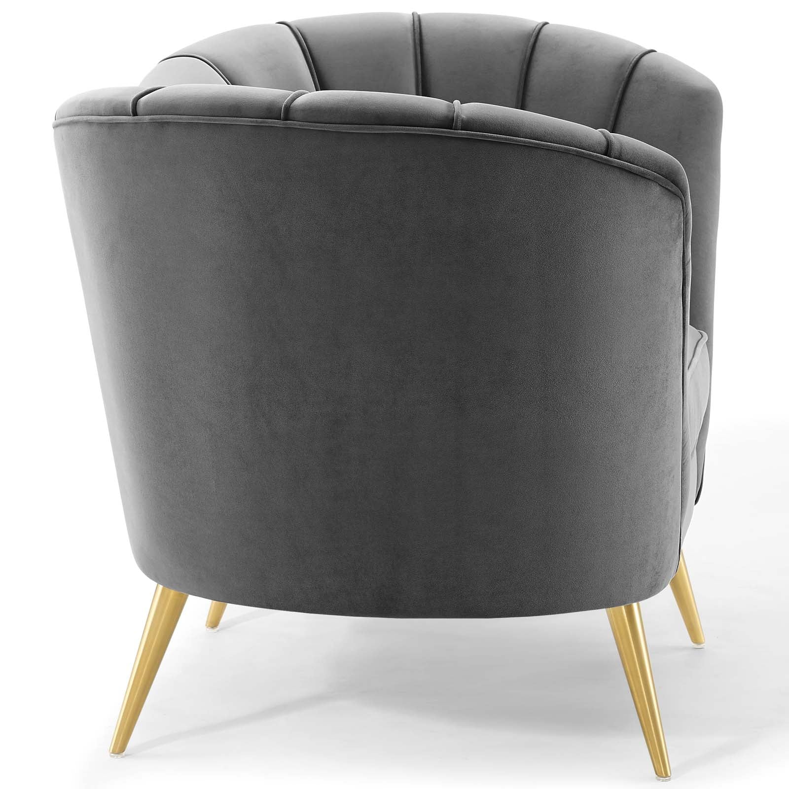 Introduce glam deco appeal with the Opportunity Vertical Channel Tufted Curved Performance Velvet Living Room Lounge Accent Armchair. Featuring a gently rolling silhouette and elegantly curved back, the Opportunity accent chair delivers a luxurious seating experience with soft, stain-resistant performance velvet upholstery, an individually wrapped pocket coil system, and dense foam padding. Complete with a removable seat cushion with a removable seat cushion, this living room armchair features interior vertical channel tufting along the interior, creating a comfortable retro-modern chair for your living room or lounge room. Opportunity's solidly constructed wood frame rests with secure precision on four splayed gold stainless steel legs and supports up to 300 lbs.